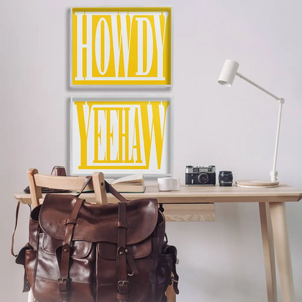 Fill any space in your home or office with our Framed Wall Art Sets. Our framed artwork is securely mounted into a 1.5-inch thick wood grain frame and ready to hang. Frames are available in three alluring styles: black, gray farmhouse and white. Stupell Wall Art is made in the USA.Features: Dimensions: 2 Piece Set, Each Panel is 14 x 1.5 x 11 FramedTwo Piece Framed Giclee Sets are available as 14"x11", 20"x16" or 30"x24" Panels. All Framed Giclee Products have a 1.5" Depth.Wall Art is Ready to Hang with Hardware Free Hanging. No installation required. For Easy Set Up Lean or Layer Artwork on Shelf or Against Wall.Curated Wall Art Sets make it easy for you complete the theme for any room. Our giclée prints are carefully mounted on a durable MDF backing, and then perfectly finished in a 1.5 inch thick woodgrain frame. Mounted frame colors include black, gray farmhouse and white. Made In USA.Artwork Relates To: Typography, Phrase, Southwestern, Cowboy, Cowgirl, Southern, Country, Howdy, YeehawDesign by Grace Popp