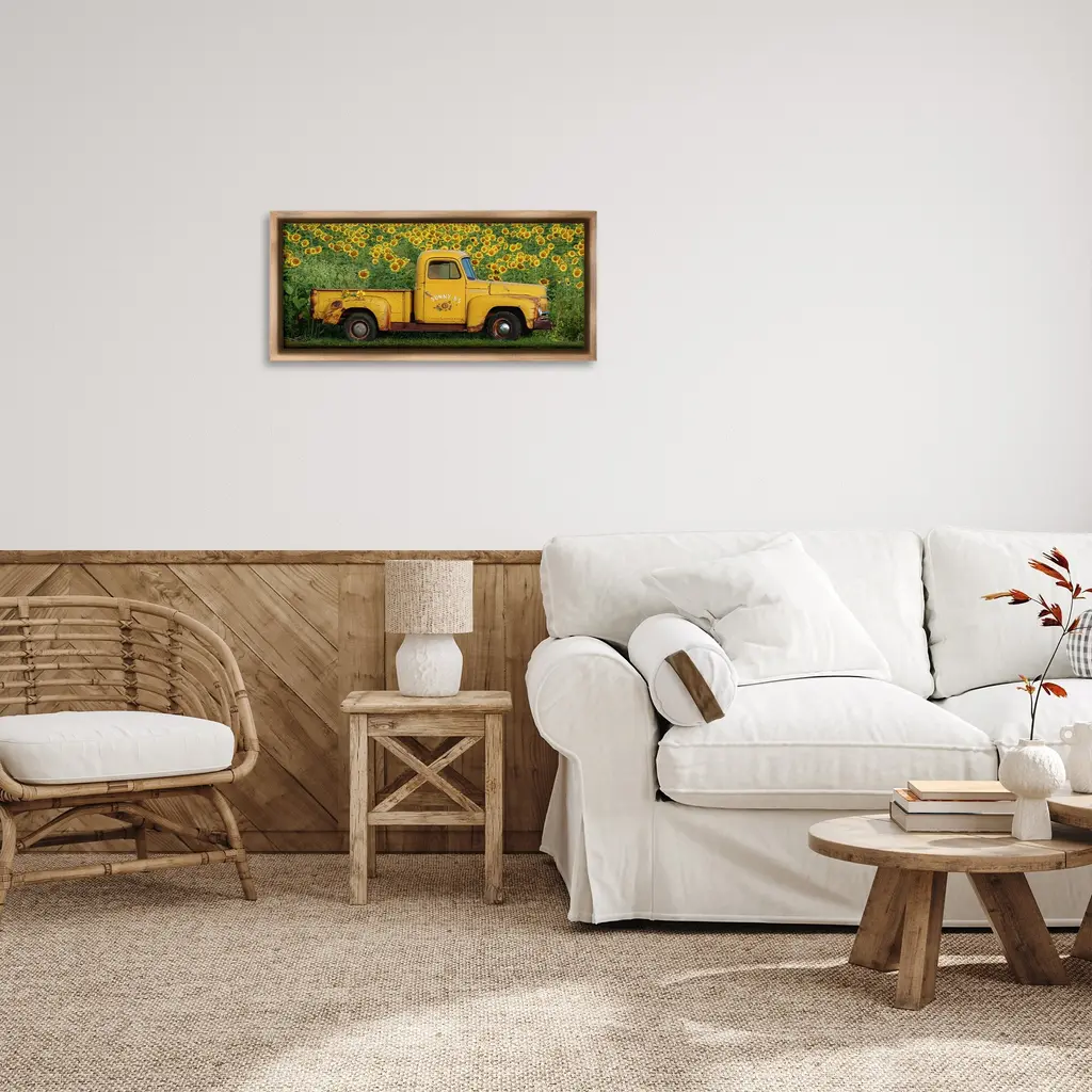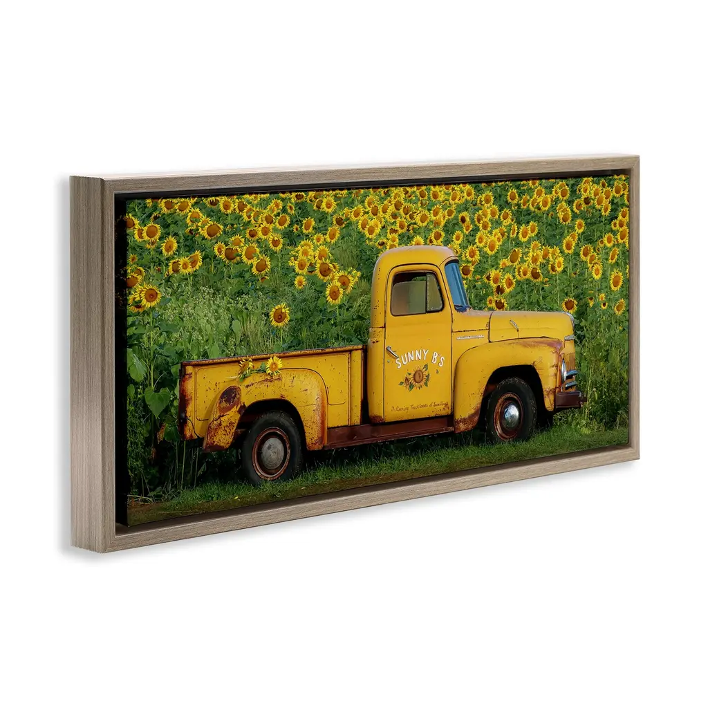 Elevate your home or office to the next level with Stupell Framed Floating Canvas Wall Art. Our premium hand-stretched canvas is mounted securely into a sturdy lightweight frame. The museum-style gap between the wrapped canvas and the box frame gives the illusion of floating artwork. Stupell Wall Art is made in the USA.Features: Dimensions: 25 x 1.7 x 11 Frame, 24 x 1.5 x 10 Canvas ArtFloating Frame Canvas Products are available in sizes 25"x11" and 31"x14". All Floating Frame Canvas Products have a 1.7" Depth.Wall Art is Ready to Hang with Hardware Free Hanging. No Installation required. For Easy Set Up Lean or Layer Artwork on Shelf or Against Wall. Artwork is Permently Fixed into the Frame.Our elevated 1.7" Thick Floating Frame is the perfect complement to our canvas style Wall Art. We use only the highest quality inks in house with industry leading printing solutions. Canvas is hand stretched over a durable wood foundation and then mounted securly into a Modern Box Frame. Made in the USA.Artwork Relates To: Truck, Vehicle, Pickup Truck, Flower, Plant, Sunflower, Nature, Meadow, CountryDesign by Carrie Ann Grippo-Pike