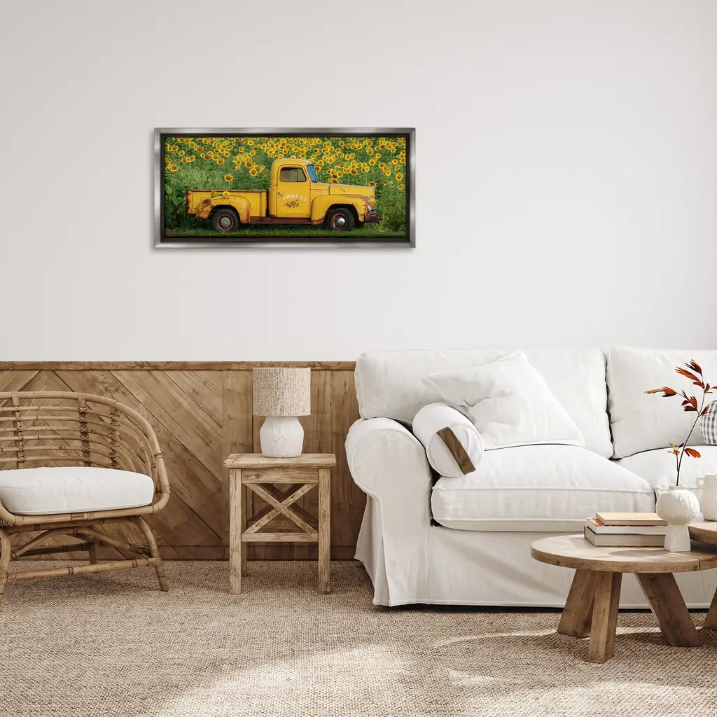 Elevate your home or office to the next level with Stupell Framed Floating Canvas Wall Art. Our premium hand-stretched canvas is mounted securely into a sturdy lightweight frame. The museum-style gap between the wrapped canvas and the box frame gives the illusion of floating artwork. Stupell Wall Art is made in the USA.Features: Dimensions: 25 x 1.7 x 11 Frame, 24 x 1.5 x 10 Canvas ArtFloating Frame Canvas Products are available in sizes 25"x11" and 31"x14". All Floating Frame Canvas Products have a 1.7" Depth.Wall Art is Ready to Hang with Hardware Free Hanging. No Installation required. For Easy Set Up Lean or Layer Artwork on Shelf or Against Wall. Artwork is Permently Fixed into the Frame.Our elevated 1.7" Thick Floating Frame is the perfect complement to our canvas style Wall Art. We use only the highest quality inks in house with industry leading printing solutions. Canvas is hand stretched over a durable wood foundation and then mounted securly into a Modern Box Frame. Made in the USA.Artwork Relates To: Truck, Vehicle, Pickup Truck, Flower, Plant, Sunflower, Nature, Meadow, CountryDesign by Carrie Ann Grippo-Pike