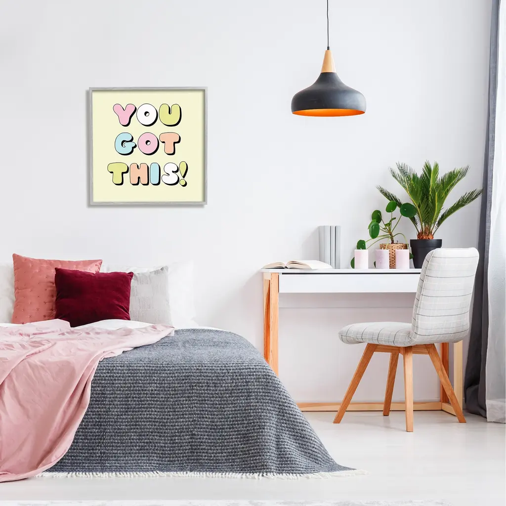 Add dimension to any room with our textured Framed Giclee Artwork. Our framed artwork is securely mounted into a 1.5-inch thick wood grain frame and ready to hang. Frames are available in three alluring styles: black, gray farmhouse and white. In addition, you should check out our oversized options if you want a statement piece. Stupell Wall Art is made in the USA.Features: Dimensions: 12 x 1.5 x 12 FramedFramed Giclee Sizes Include Standard: 12 x 1.5 x 12 Large: 17 x 1.5 x 17 Oversized: 24 x 1.5 x 24Wall Art is Ready to Hang - No Installation or Hardware Needed. For Easy Set Up Lean or Layer Artwork on Shelf or Against Wall.Our giclée prints are carefully mounted on a durable MDF backing, and then perfectly finished in a 1.5 inch thick woodgrain frame. Mounted frame colors include black, gray farmhouse and white. Made In USA.Artwork Relates To: Inspirational, Motivational, Phrase, Yellow, You Got This!Design by Lula Bijoux & co.
