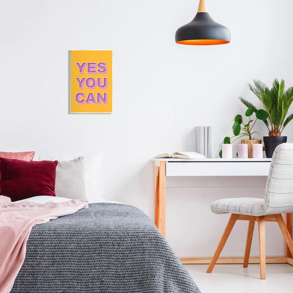 Our wall plaques start as high-quality lithograph prints mounted on durable 0.5-inch thick MDF wood. Each piece is hand finished and comes with a fresh layer of white foil on the sides to give it a crisp, clean look. Plaques arrive ready to hang without installation and come with removable plastic corners to keep them from damage in transit. Wall Art is made in the USA.Features: Dimensions: 10 x 0.5 x 15 InchesWall Plaque Sizes Include Standard: 10 x 0.5 x 15 Oversized: 13 x 0.5 x 19Wall Art is Ready to Hang with Hardware Free Hanging. No installation required. For Easy Set Up Lean or Layer Artwork on Shelf or Against Wall.All of our wall plaques start off as high quality lithograph prints that are then mounted on durable 0.5 inch thick MDF wood. Each piece is hand finished and comes with a fresh layer of foil on the sides to give it a crisp clean look. Made In USA.Artwork Relates To: Phrase, Text, Yellow, Purple, Simple, Yes You CanDesign by Martina Pavlova