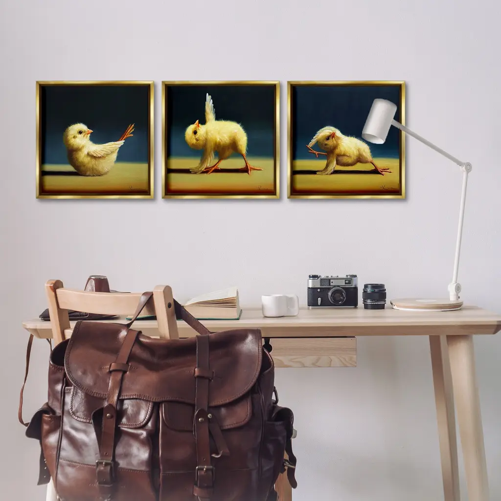 Elevate your home or office to the next level with Stupell Framed Floating Canvas Wall Art. Our premium hand-stretched canvas is mounted securely into a sturdy lightweight frame. The museum-style gap between the wrapped canvas and the box frame gives the illusion of floating artwork. Stupell Wall Art is made in the USA.Features: Dimensions: 3 Piece Set, Each Frame is 18 x 1.7 x 18Three Piece Floating Frame Canvas Products are available as 18"x18" or 25"x25" Panels. All Floating Frame Canvas Products have a 1.7" Depth.Wall Art is Ready to Hang with Hardware Free Hanging. No Installation required. For Easy Set Up Lean or Layer Artwork on Shelf or Against Wall. Artwork is Permently Fixed into the Frame.Our elevated 1.7" Thick Floating Frame is the perfect complement to our canvas style Wall Art. We use only the highest quality inks in house with industry leading printing solutions. Canvas is hand stretched over a durable wood foundation and then mounted securly into a Modern Box Frame. Made in the USA.Artwork Relates To: Animal, Bird, Chick, Yoga, Exercise, HumorDesign by Lucia Heffernan