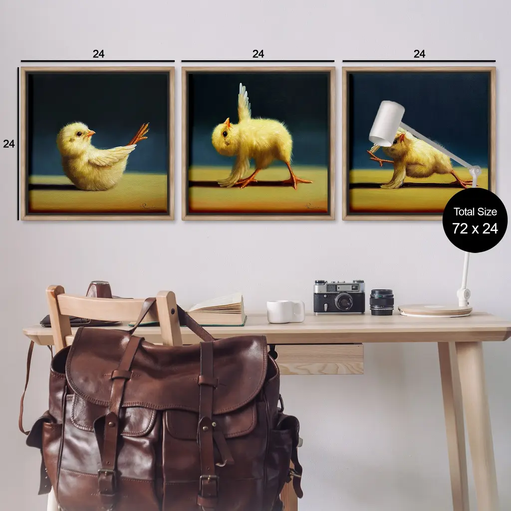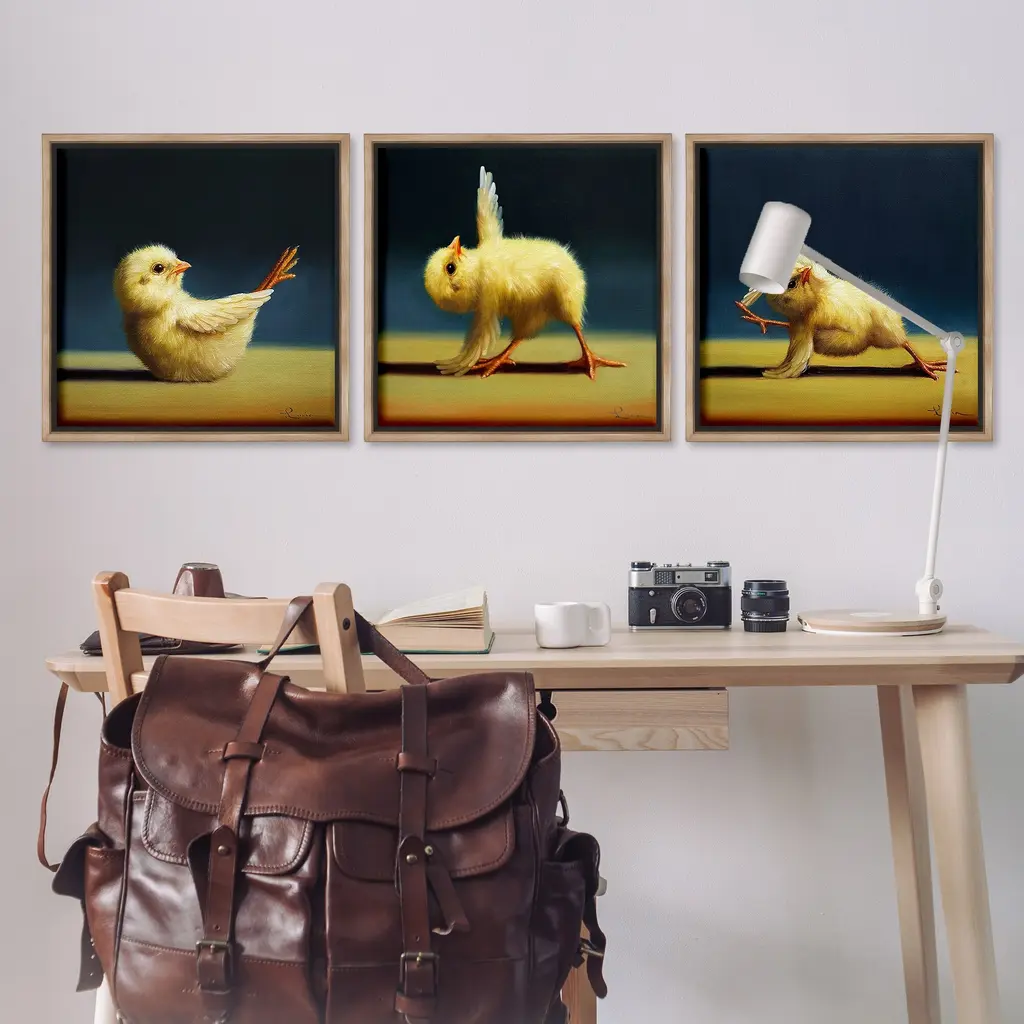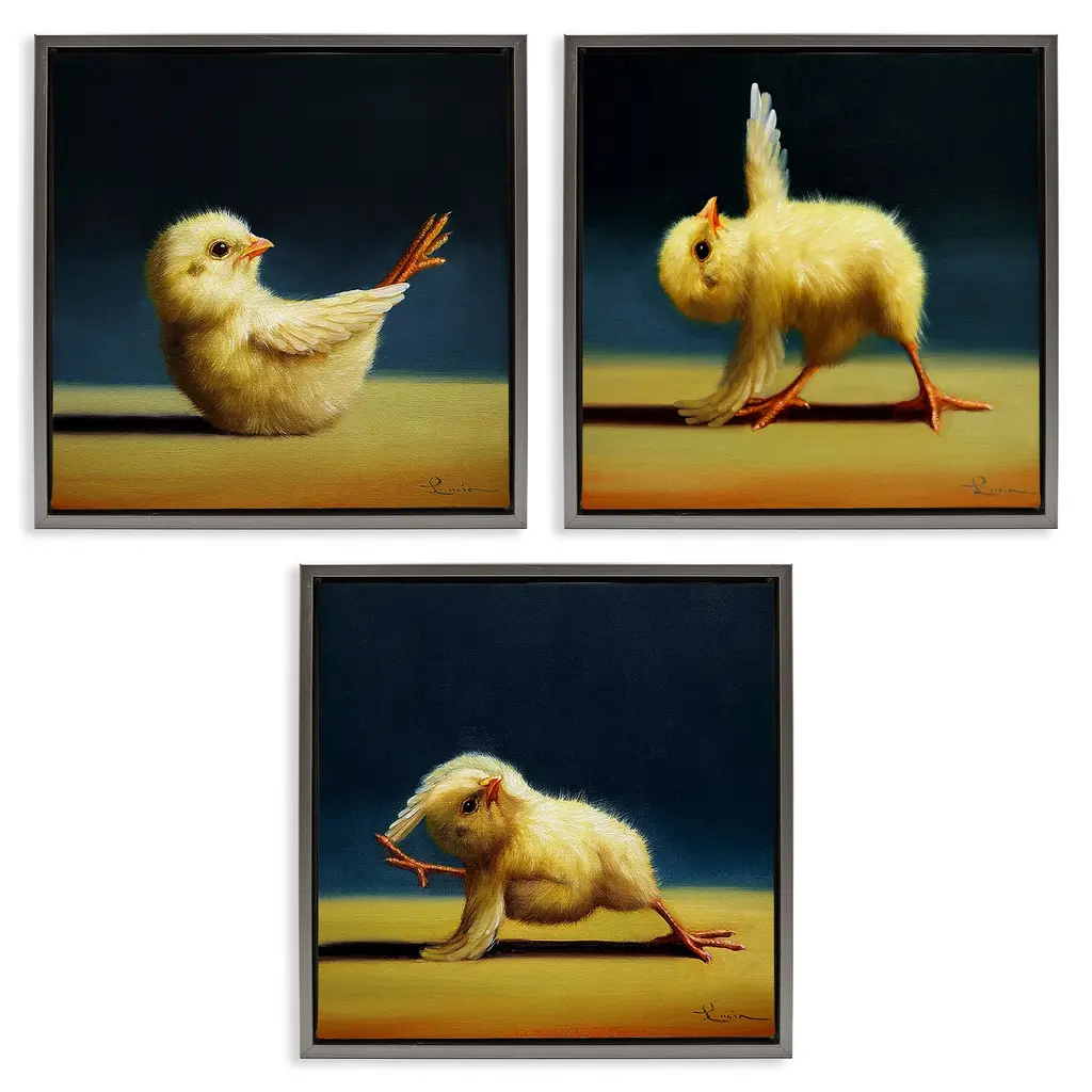 Elevate your home or office to the next level with Stupell Framed Floating Canvas Wall Art. Our premium hand-stretched canvas is mounted securely into a sturdy lightweight frame. The museum-style gap between the wrapped canvas and the box frame gives the illusion of floating artwork. Stupell Wall Art is made in the USA.Features: Dimensions: 3 Piece Set, Each Frame is 18 x 1.7 x 18Three Piece Floating Frame Canvas Products are available as 18"x18" or 25"x25" Panels. All Floating Frame Canvas Products have a 1.7" Depth.Wall Art is Ready to Hang with Hardware Free Hanging. No Installation required. For Easy Set Up Lean or Layer Artwork on Shelf or Against Wall. Artwork is Permently Fixed into the Frame.Our elevated 1.7" Thick Floating Frame is the perfect complement to our canvas style Wall Art. We use only the highest quality inks in house with industry leading printing solutions. Canvas is hand stretched over a durable wood foundation and then mounted securly into a Modern Box Frame. Made in the USA.Artwork Relates To: Animal, Bird, Chick, Yoga, Exercise, HumorDesign by Lucia Heffernan
