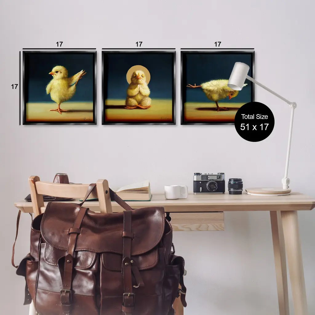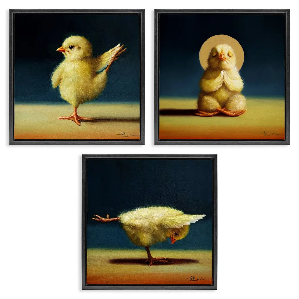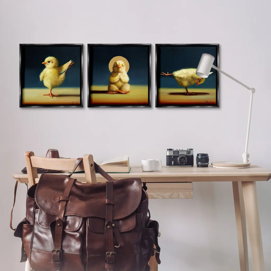 Elevate your home or office to the next level with Stupell Framed Floating Canvas Wall Art. Our premium hand-stretched canvas is mounted securely into a sturdy lightweight frame. The museum-style gap between the wrapped canvas and the box frame gives the illusion of floating artwork. Stupell Wall Art is made in the USA.Features: Dimensions: 3 Piece Set, Each Frame is 18 x 1.7 x 18Three Piece Floating Frame Canvas Products are available as 18"x18" or 25"x25" Panels. All Floating Frame Canvas Products have a 1.7" Depth.Wall Art is Ready to Hang with Hardware Free Hanging. No Installation required. For Easy Set Up Lean or Layer Artwork on Shelf or Against Wall. Artwork is Permently Fixed into the Frame.Our elevated 1.7" Thick Floating Frame is the perfect complement to our canvas style Wall Art. We use only the highest quality inks in house with industry leading printing solutions. Canvas is hand stretched over a durable wood foundation and then mounted securly into a Modern Box Frame. Made in the USA.Artwork Relates To: Animal, Bird, Chick, Yoga, Exercise, HumorDesign by Lucia Heffernan