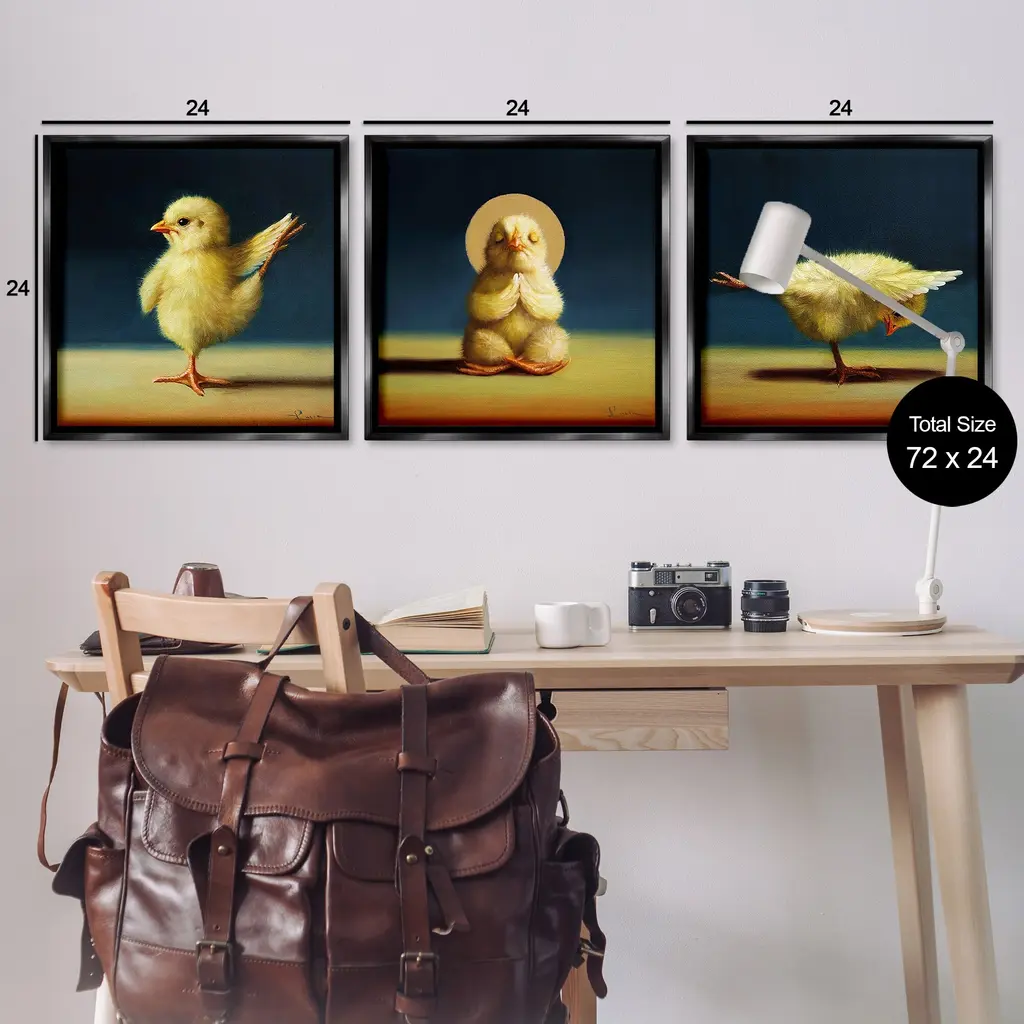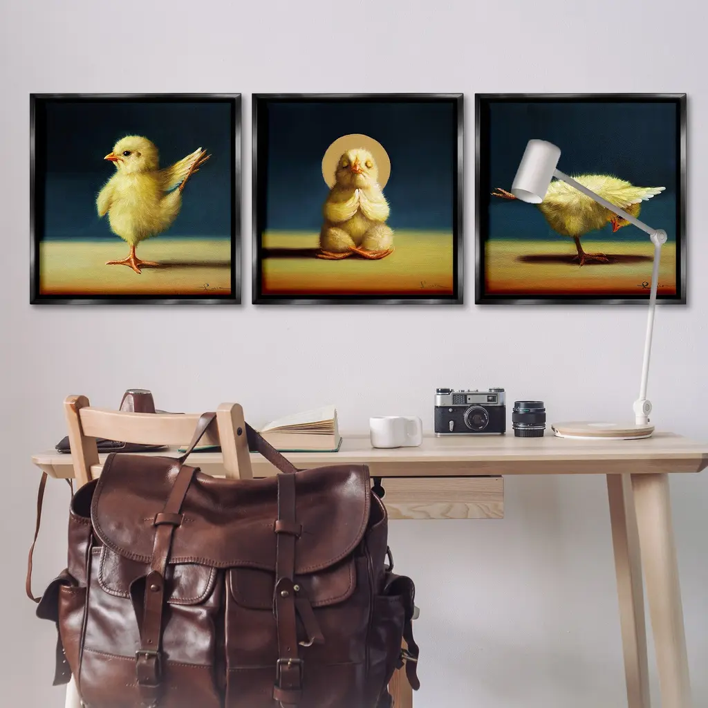 Elevate your home or office to the next level with Stupell Framed Floating Canvas Wall Art. Our premium hand-stretched canvas is mounted securely into a sturdy lightweight frame. The museum-style gap between the wrapped canvas and the box frame gives the illusion of floating artwork. Stupell Wall Art is made in the USA.Features: Dimensions: 3 Piece Set, Each Frame is 18 x 1.7 x 18Three Piece Floating Frame Canvas Products are available as 18"x18" or 25"x25" Panels. All Floating Frame Canvas Products have a 1.7" Depth.Wall Art is Ready to Hang with Hardware Free Hanging. No Installation required. For Easy Set Up Lean or Layer Artwork on Shelf or Against Wall. Artwork is Permently Fixed into the Frame.Our elevated 1.7" Thick Floating Frame is the perfect complement to our canvas style Wall Art. We use only the highest quality inks in house with industry leading printing solutions. Canvas is hand stretched over a durable wood foundation and then mounted securly into a Modern Box Frame. Made in the USA.Artwork Relates To: Animal, Bird, Chick, Yoga, Exercise, HumorDesign by Lucia Heffernan
