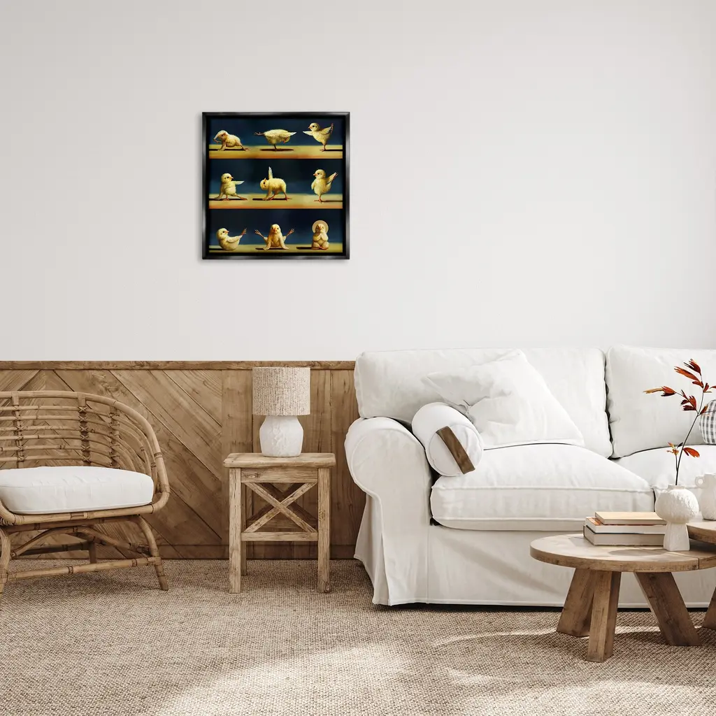 Elevate your home or office to the next level with Stupell Framed Floating Canvas Wall Art. Our premium hand-stretched canvas is mounted securely into a sturdy lightweight frame. The museum-style gap between the wrapped canvas and the box frame gives the illusion of floating artwork. Stupell Wall Art is made in the USA.Features: Dimensions: 18 x 1.7 x 18 Frame, 17 x 1.5 x 17 Canvas ArtFloating Frame Canvas Products are available in sizes 18"x18" and 25"x25". All Floating Frame Canvas Products have a 1.7" Depth.Wall Art is Ready to Hang with Hardware Free Hanging. No Installation required. For Easy Set Up Lean or Layer Artwork on Shelf or Against Wall. Artwork is Permently Fixed into the Frame.Our elevated 1.7" Thick Floating Frame is the perfect complement to our canvas style Wall Art. We use only the highest quality inks in house with industry leading printing solutions. Canvas is hand stretched over a durable wood foundation and then mounted securly into a Modern Box Frame. Made in the USA.Artwork Relates To: Animal, Humor, Exercise, Yoga, Chick, BirdDesign by Lucia Heffernan