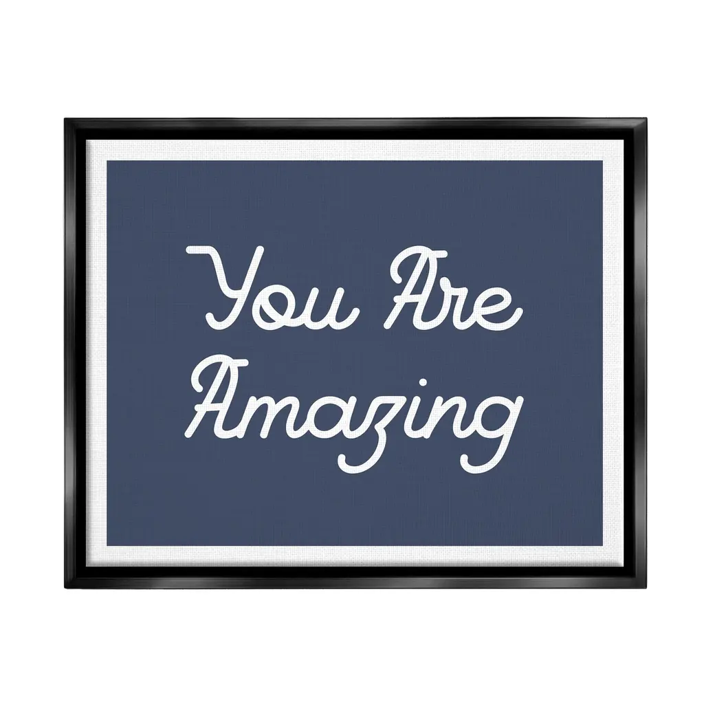 Elevate your home or office to the next level with Stupell Framed Floating Canvas Wall Art. Our premium hand-stretched canvas is mounted securely into a sturdy lightweight frame. The museum-style gap between the wrapped canvas and the box frame gives the illusion of floating artwork. Stupell Wall Art is made in the USA.Features: Dimensions: 21 x 1.7 x 17 Frame, 20 x 1.5 x 16 Canvas ArtFloating Frame Sizes Include Standard: 21 x 1.7 x 17 Oversized: 31 x 1.7 x 25Wall Art is Ready to Hang - No Installation or Hardware Needed. For Easy Set Up Lean or Layer Artwork on Shelf or Against Wall.Our elevated 1.7" Thick Floating Frame is the perfect complement to our canvas style Wall Art. We use only the highest quality inks in house with industry leading printing solutions. Canvas is hand stretched over a durable wood foundation and then mounted securly into a Modern Box Frame. Made in the USA.Artwork Relates To: Phrase, Self Confidence, Uplifting, You Are AmazingDesign by Lil' Rue