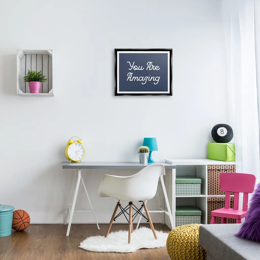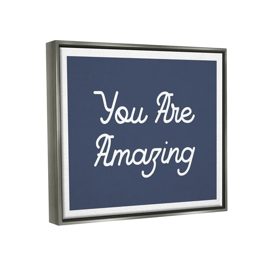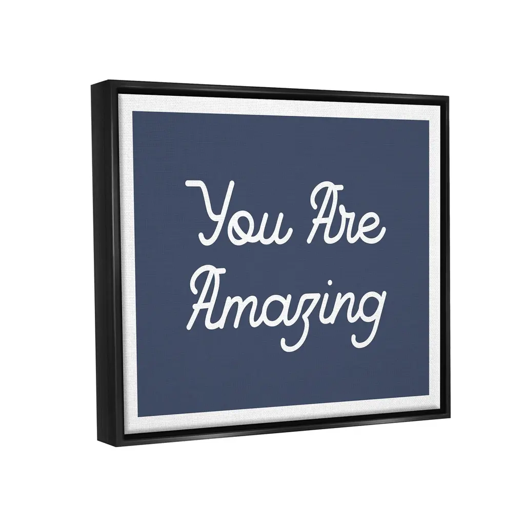 Elevate your home or office to the next level with Stupell Framed Floating Canvas Wall Art. Our premium hand-stretched canvas is mounted securely into a sturdy lightweight frame. The museum-style gap between the wrapped canvas and the box frame gives the illusion of floating artwork. Stupell Wall Art is made in the USA.Features: Dimensions: 21 x 1.7 x 17 Frame, 20 x 1.5 x 16 Canvas ArtFloating Frame Sizes Include Standard: 21 x 1.7 x 17 Oversized: 31 x 1.7 x 25Wall Art is Ready to Hang - No Installation or Hardware Needed. For Easy Set Up Lean or Layer Artwork on Shelf or Against Wall.Our elevated 1.7" Thick Floating Frame is the perfect complement to our canvas style Wall Art. We use only the highest quality inks in house with industry leading printing solutions. Canvas is hand stretched over a durable wood foundation and then mounted securly into a Modern Box Frame. Made in the USA.Artwork Relates To: Phrase, Self Confidence, Uplifting, You Are AmazingDesign by Lil' Rue