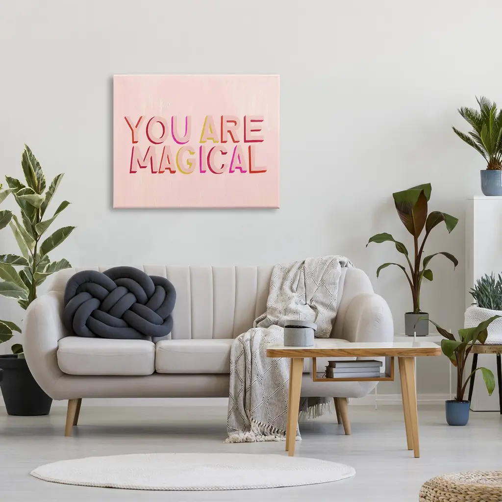 We create our stretched canvas to the highest standards. Using only the highest quality inks and canvas on Mimaki printers, we hand-cut and stretch each piece over a 1.5-inch thick wooden frame for hanging. As a result, the art comes ready to hang on the sturdy ledge with no installation required. Stupell Wall Art is made in the USA.Features: Dimensions: 20 x 1.5 x 16 InchesStretched Canvas Sizes Include Standard: 20 x 1.5 x 16 Large: 30 x 1.5 x 20 X-Large: 40 x 1.5 x 30 Oversized: 48 x 1.5 x 36Wall Art is Ready to Hang - No Installation or Hardware Needed. For Easy Set Up Lean or Layer Artwork on Shelf or Against Wall.Our stretched canvas is created with the highest standards. We use only the highest quality inks and canvas on our in house Mimaki printers, and then hand cut and stretch each piece over a 1.5 inch thick wooden frame for hanging. Made In USA.Artwork Relates To: Pink, Uplifting, Inspirational, You Are MagicalDesign by Grace Popp