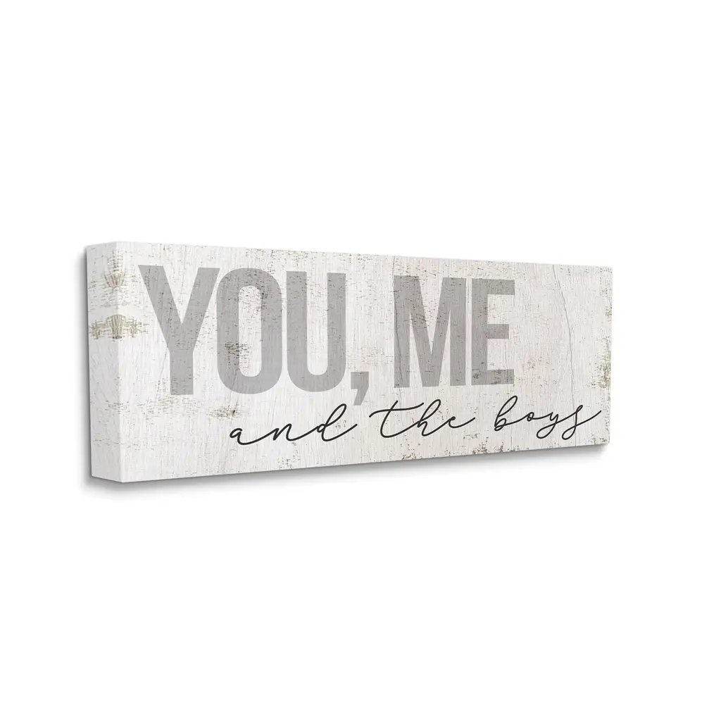 We create our stretched canvas to the highest standards. Using only the highest quality inks and canvas on Mimaki printers, we hand-cut and stretch each piece over a 1.5-inch thick wooden frame for hanging. As a result, the art comes ready to hang on the sturdy ledge with no installation required. Stupell Wall Art is made in the USA.Features: Dimensions: 24 x 1.5 x 10 InchesStretched Canvas Sizes Include Standard: 24 x 1.5 x 10 Large: 30 x 1.5 x 13 X-Large: 40 x 1.5 x 17 Oversized: 48 x 1.5 x 20Wall Art is Ready to Hang - No Installation or Hardware Needed. For Easy Set Up Lean or Layer Artwork on Shelf or Against Wall.Our stretched canvas is created with the highest standards. We use only the highest quality inks and canvas on our in house Mimaki printers, and then hand cut and stretch each piece over a 1.5 inch thick wooden frame for hanging. Made In USA.Artwork Relates To: Family, Farmhouse, Love, You Me And The BoysDesign by Lil' Rue