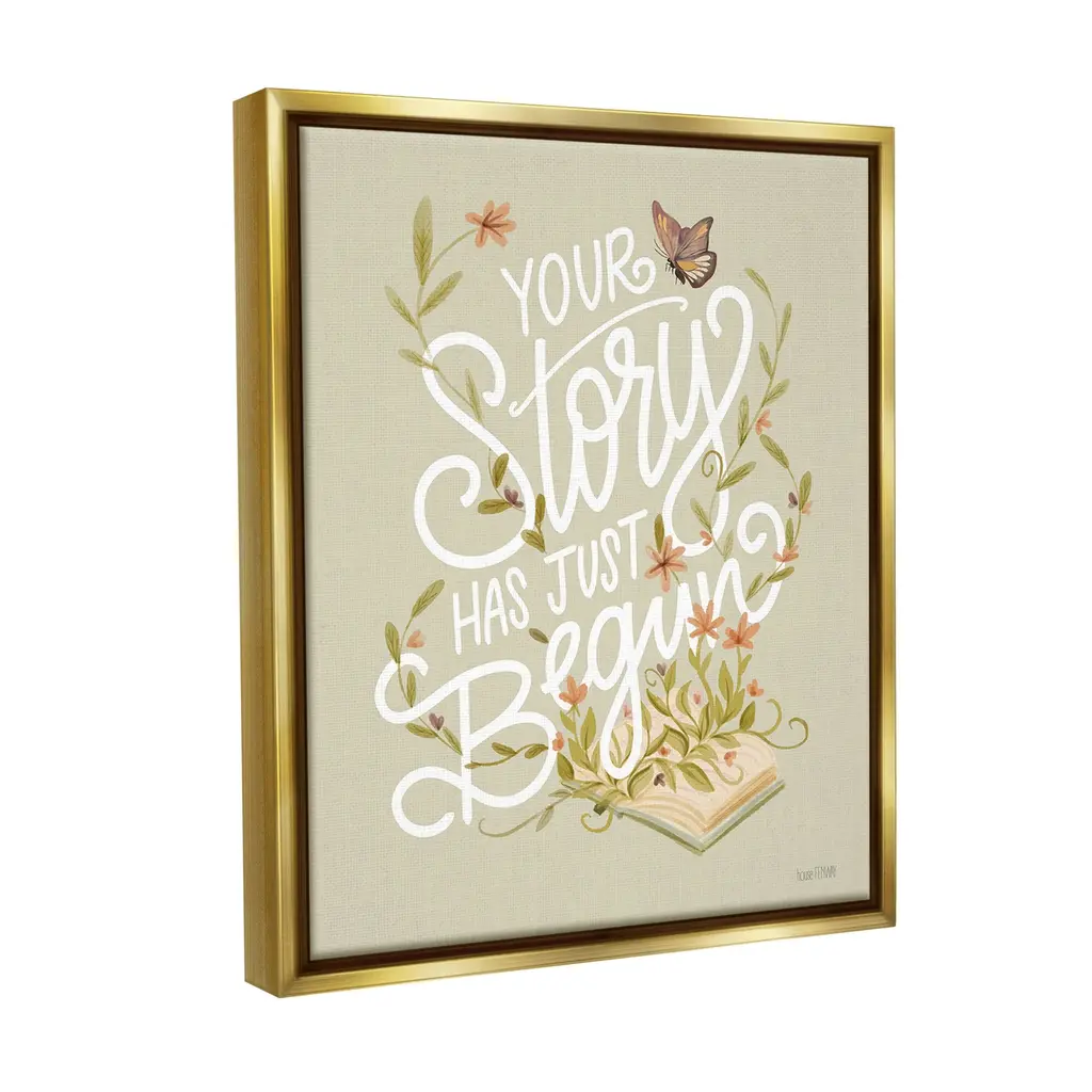 Elevate your home or office to the next level with Stupell Framed Floating Canvas Wall Art. Our premium hand-stretched canvas is mounted securely into a sturdy lightweight frame. The museum-style gap between the wrapped canvas and the box frame gives the illusion of floating artwork. Stupell Wall Art is made in the USA.Features: Dimensions: 17 x 1.7 x 21 Frame, 16 x 1.5 x 20 Canvas ArtFloating Frame Canvas Products are available in sizes 17"x21" and 25"x31". All Floating Frame Canvas Products have a 1.7" Depth.Wall Art is Ready to Hang with Hardware Free Hanging. No Installation required. For Easy Set Up Lean or Layer Artwork on Shelf or Against Wall. Artwork is Permently Fixed into the Frame.Our elevated 1.7" Thick Floating Frame is the perfect complement to our canvas style Wall Art. We use only the highest quality inks in house with industry leading printing solutions. Canvas is hand stretched over a durable wood foundation and then mounted securly into a Modern Box Frame. Made in the USA.Artwork Relates To: Bug, Animal, Butterfly, Insect, Phrase, Floral, Flower, Cottage, Book, Reading, Your Story Has Just BegunDesign by House Fenway