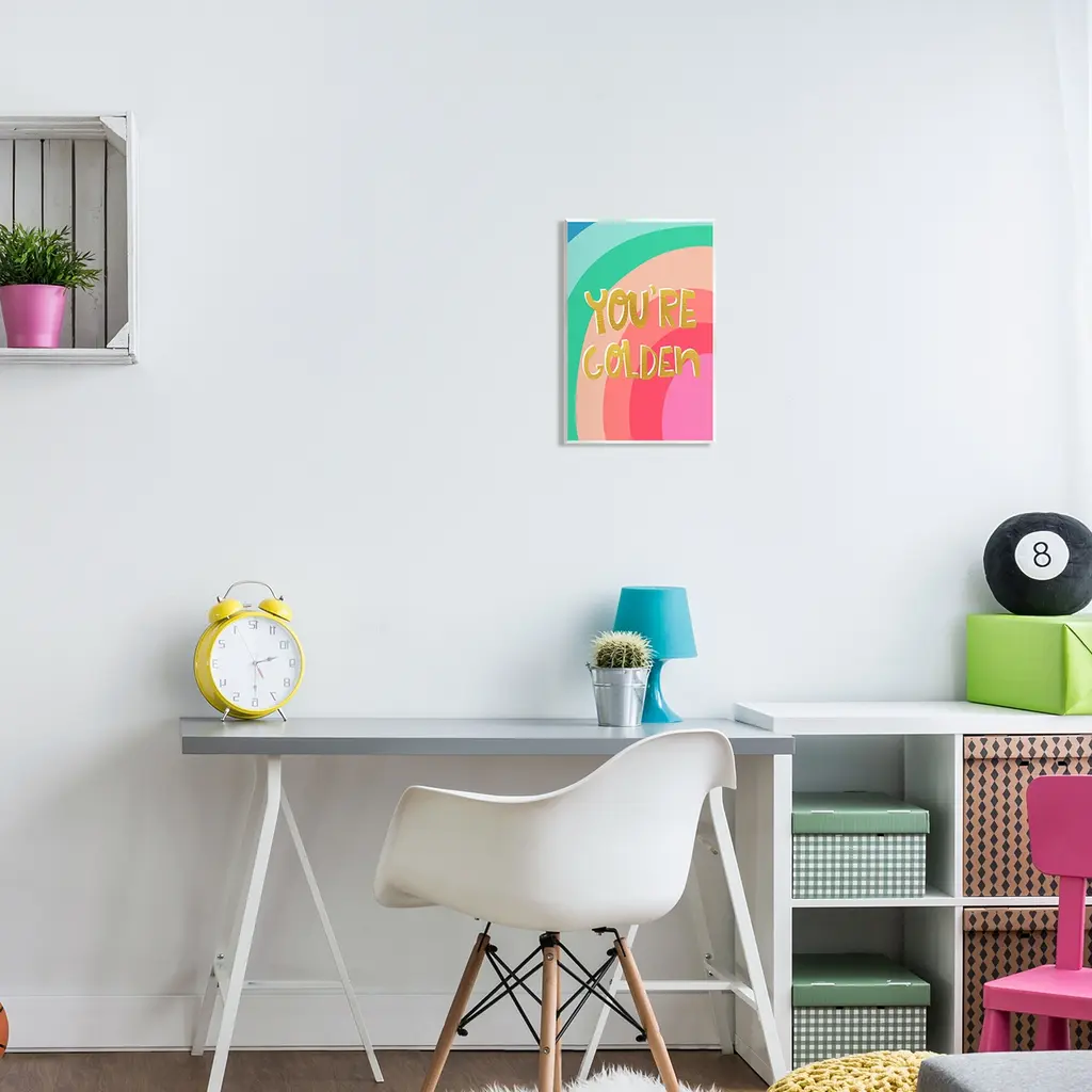 Our wall plaques start as high-quality lithograph prints mounted on durable 0.5-inch thick MDF wood. Each piece is hand finished and comes with a fresh layer of white foil on the sides to give it a crisp, clean look. Plaques arrive ready to hang without installation and come with removable plastic corners to keep them from damage in transit. Stupell Wall Art is made in the USA.Features: Dimensions: 10 x 0.5 x 15 InchesWall Plaque Sizes Include Standard: 10 x 0.5 x 15 Oversized: 13 x 0.5 x 19Wall Art is Ready to Hang with Hardware Free Hanging. No installation required. For Easy Set Up Lean or Layer Artwork on Shelf or Against Wall.All of our wall plaques start off as high quality lithograph prints that are then mounted on durable 0.5 inch thick MDF wood. Each piece is hand finished and comes with a fresh layer of foil on the sides to give it a crisp clean look. Made In USA.Artwork Relates To: Phrase, Rainbow, Uplifting, Pattern, You're GoldenDesign by Pragya Kothari