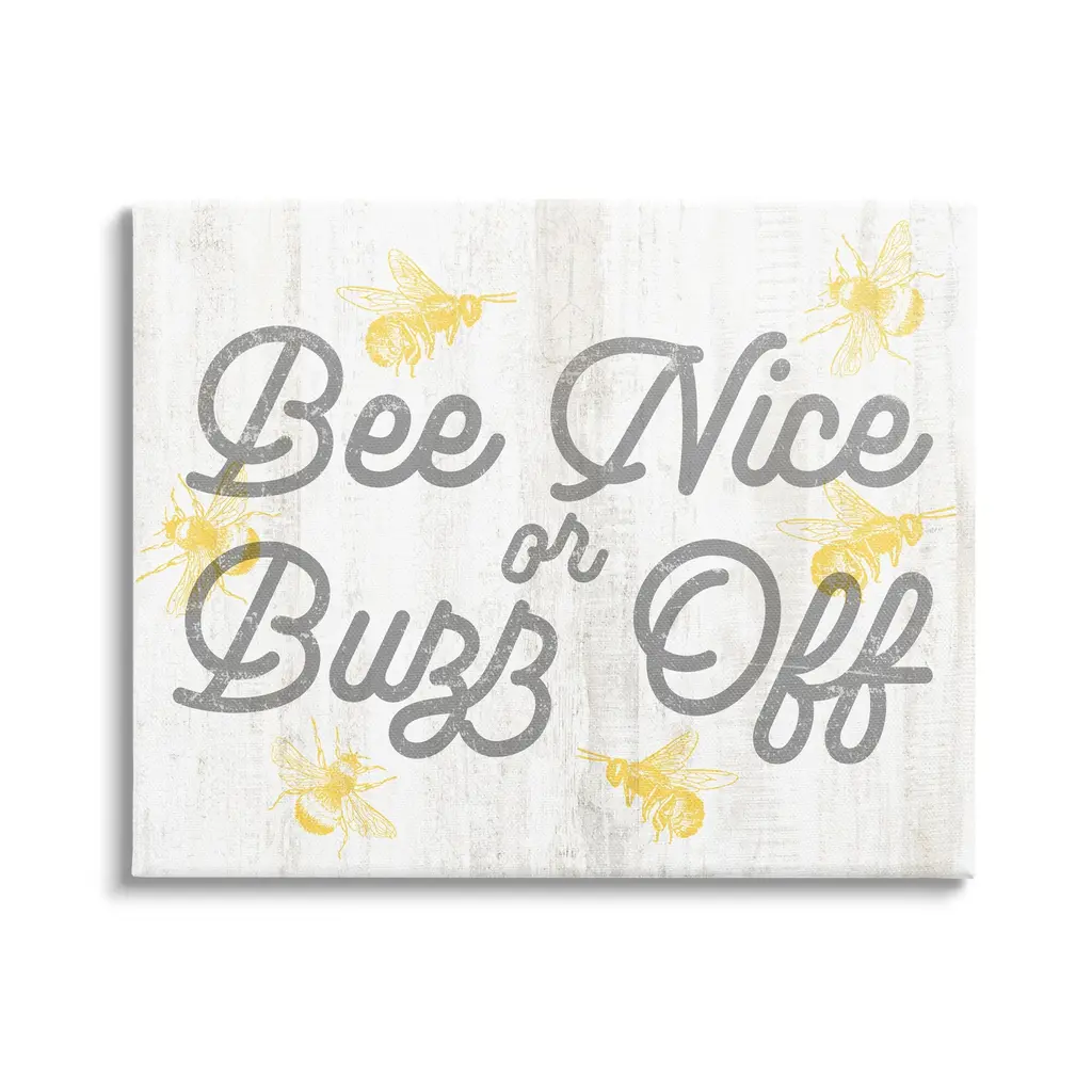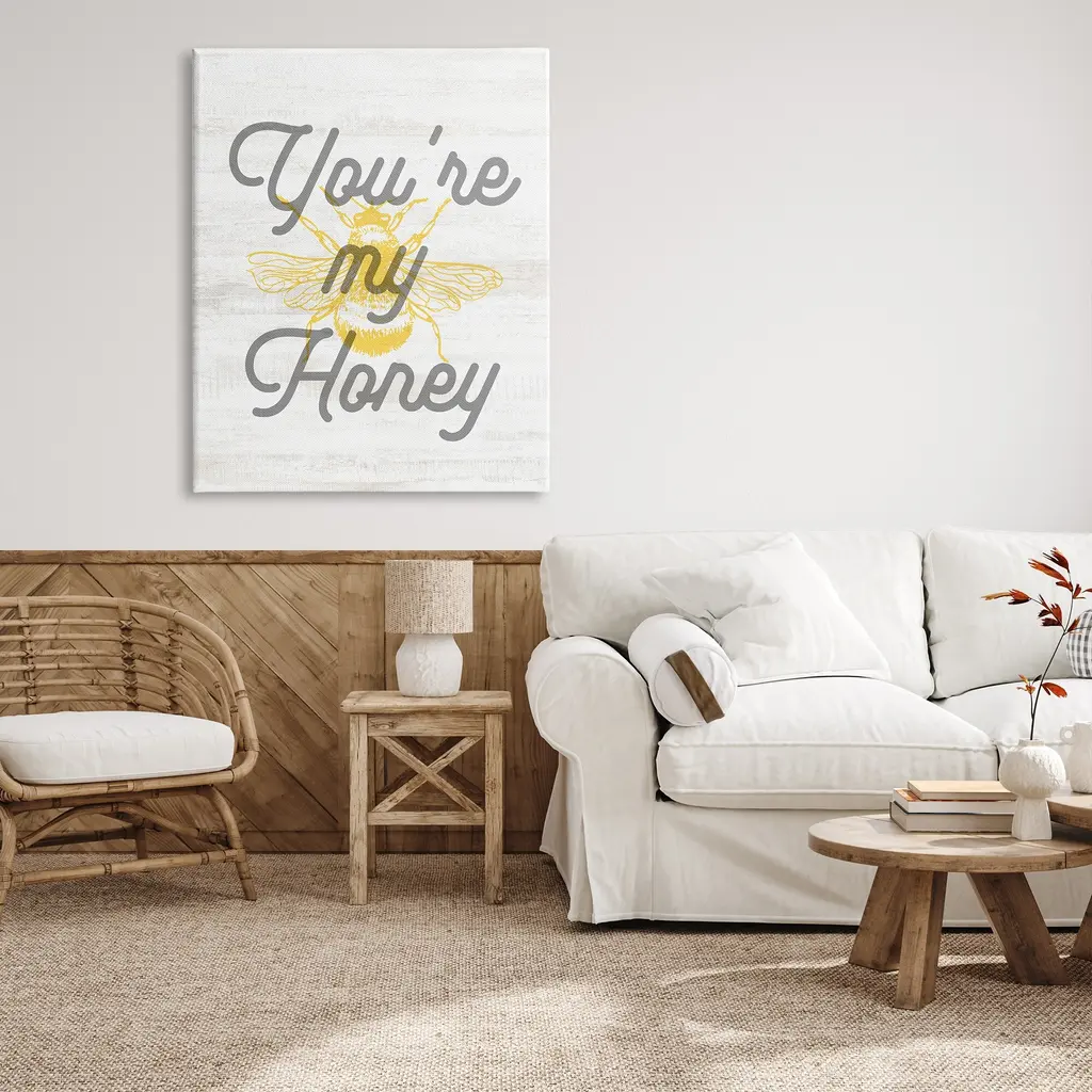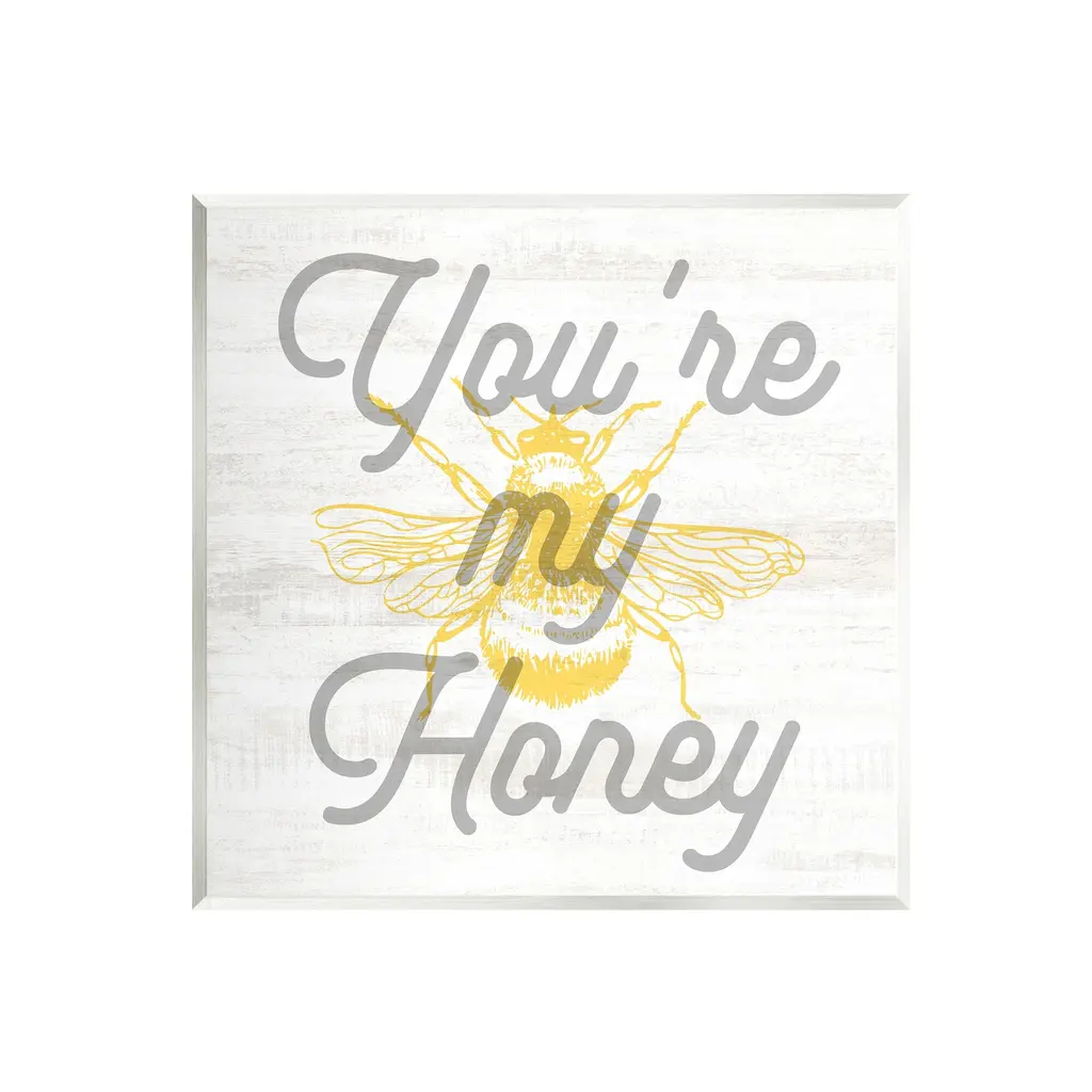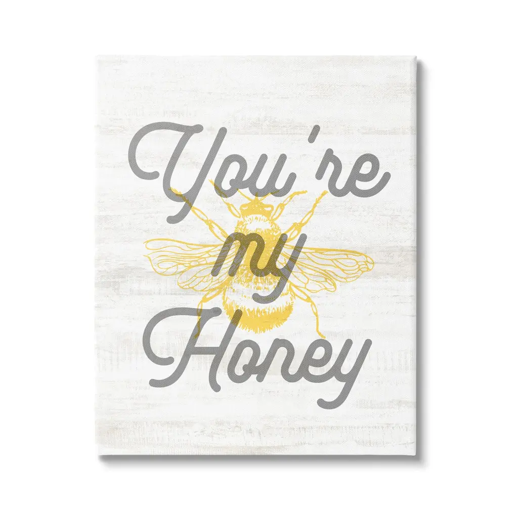 We create our stretched canvas to the highest standards. Using only the highest quality inks and canvas on Mimaki printers, we hand-cut and stretch each piece over a 1.5-inch thick wooden frame for hanging. As a result, the art comes ready to hang on the sturdy ledge with no installation required. Stupell Wall Art is made in the USA.Features: Dimensions: 16 x 1.5 x 20 InchesStretched Canvas Sizes Include Standard: 16 x 1.5 x 20 Large: 20 x 1.5 x 30 X-Large: 30 x 1.5 x 40 Oversized: 36 x 1.5 x 48Wall Art is Ready to Hang with Hardware Free Hanging. No installation required. For Easy Set Up Lean or Layer Artwork on Shelf or Against Wall.Our stretched canvas is created with the highest standards. We use only the highest quality inks and canvas on our in house Mimaki printers, and then hand cut and stretch each piece over a 1.5 inch thick wooden frame for hanging. Made In USA.Artwork Relates To: Animal, Insect, Invertebrate, Bee, Bumblebee, Phrase, Romance, You're My HoneyDesign by Lil' Rue