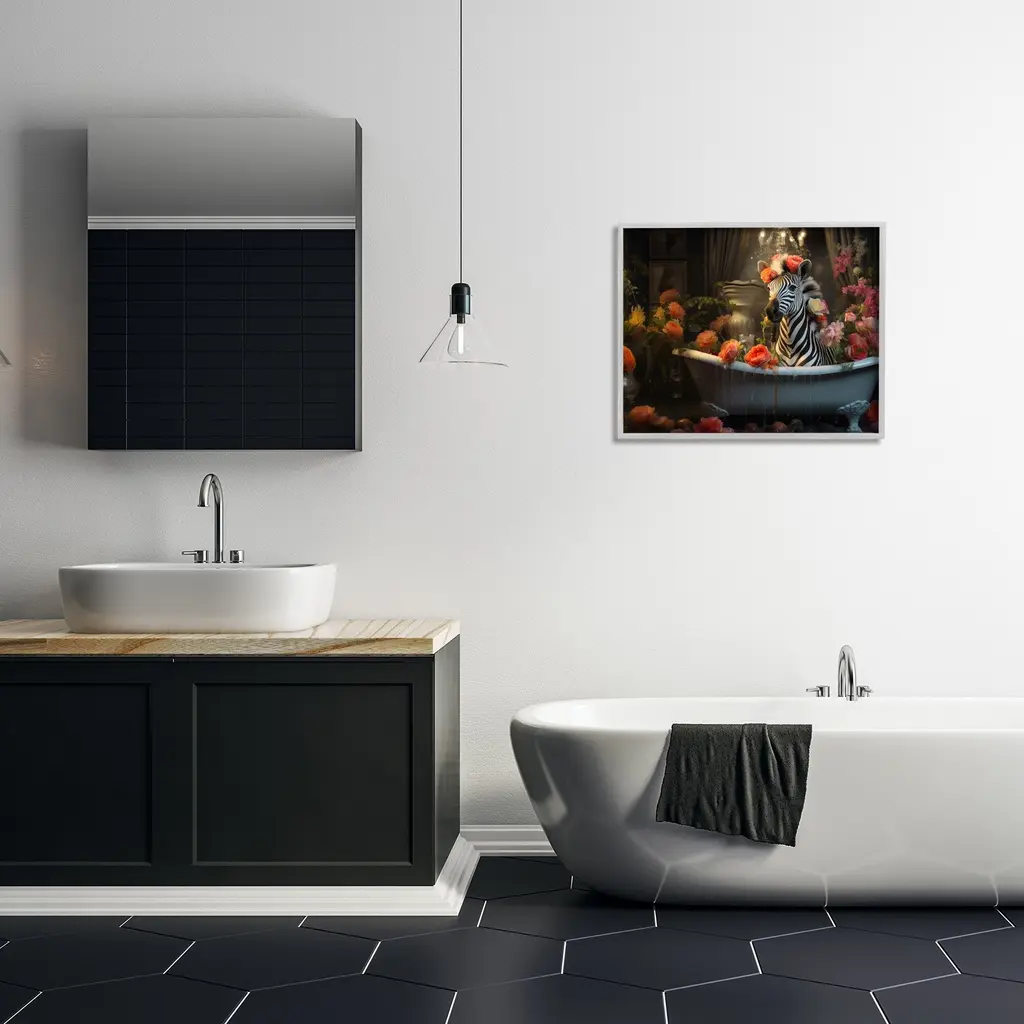 Add dimension to any room with our textured Framed Giclee Artwork. Our framed artwork is securely mounted into a 1.5-inch thick wood grain frame and ready to hang. Frames are available in three alluring styles: black, gray farmhouse and white. In addition, you should check out our oversized options if you want a statement piece. Stupell Wall Art is made in the USA.Features: Dimensions: 14 x 1.5 x 11 FramedFramed Giclee Products are available in the sizes 14"x11", 20"x16" or 30"x24". All Framed Giclee Products have a 1.5" Depth. Wall Art is Ready to Hang with Hardware Free Hanging. No installation required. For Easy Set Up Lean or Layer Artwork on Shelf or Against Wall.Our giclée prints are carefully mounted on a durable MDF backing, and then perfectly finished in a 1.5 inch thick woodgrain frame. Mounted frame colors include black, gray farmhouse and white. Made In USA.Artwork Relates To: Bathroom, Animal, Tub, Flower, Blossom, Zebra, RosesDesign by Lazar Studio