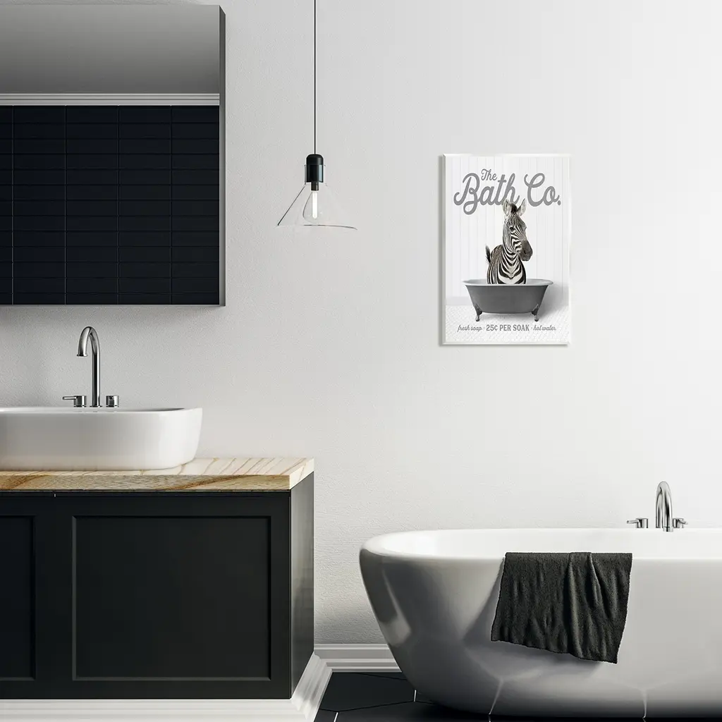Our wall plaques start as high-quality lithograph prints mounted on durable 0.5-inch thick MDF wood. Each piece is hand finished and comes with a fresh layer of white foil on the sides to give it a crisp, clean look. Plaques arrive ready to hang without installation and come with removable plastic corners to keep them from damage in transit. Stupell Wall Art is made in the USA.Features: Dimensions: 10 x 0.5 x 15 InchesWall Plaque Sizes Include Standard: 10 x 0.5 x 15 Oversized: 13 x 0.5 x 19Wall Art is Ready to Hang with Hardware Free Hanging. No installation required. For Easy Set Up Lean or Layer Artwork on Shelf or Against Wall.All of our wall plaques start off as high quality lithograph prints that are then mounted on durable 0.5 inch thick MDF wood. Each piece is hand finished and comes with a fresh layer of foil on the sides to give it a crisp clean look. Made In USA.Artwork Relates To: Animal, Mammal, Wildlife, Bathroom, Rustic, Bathtub, The Bath Co, ZebraDesign by Lettered and Lined