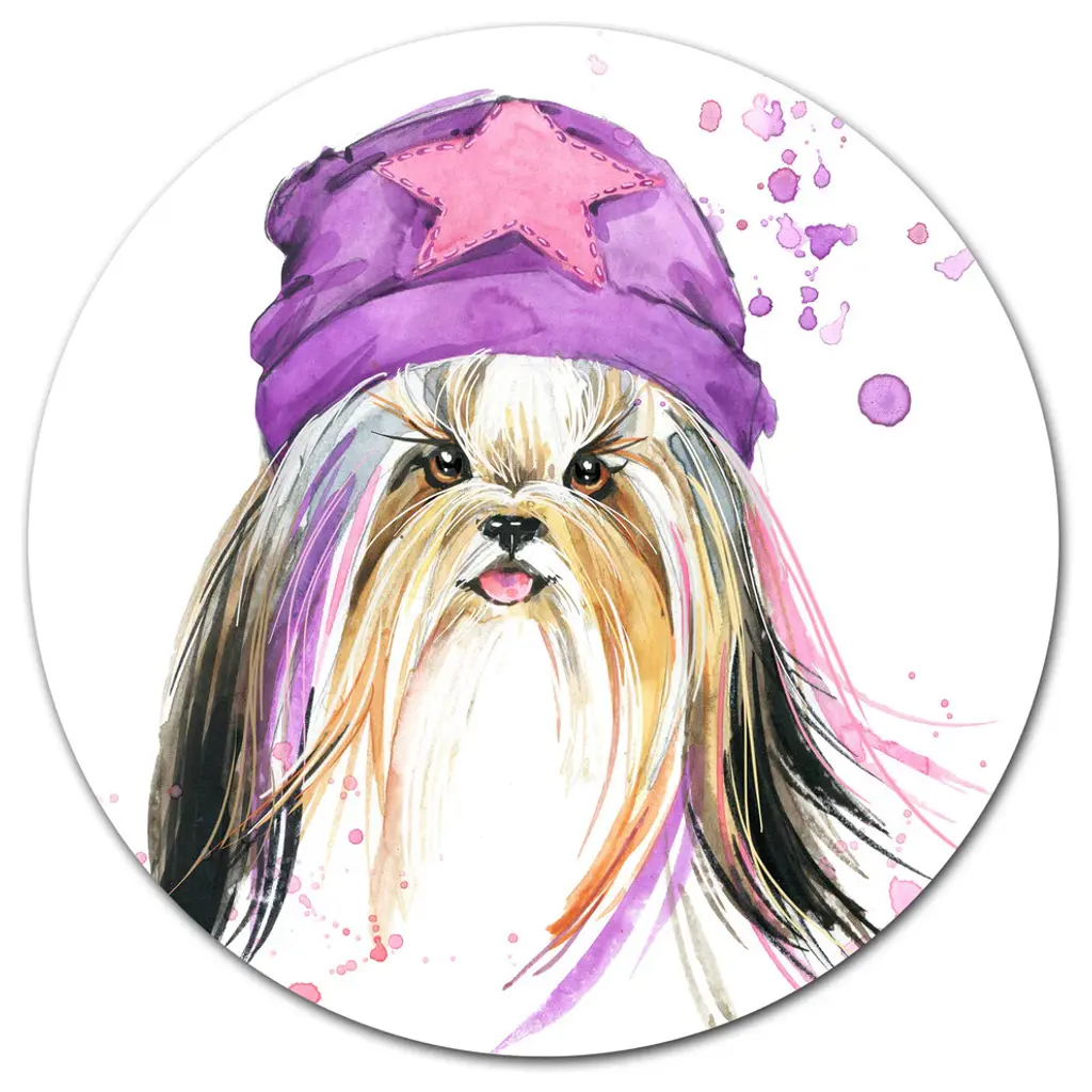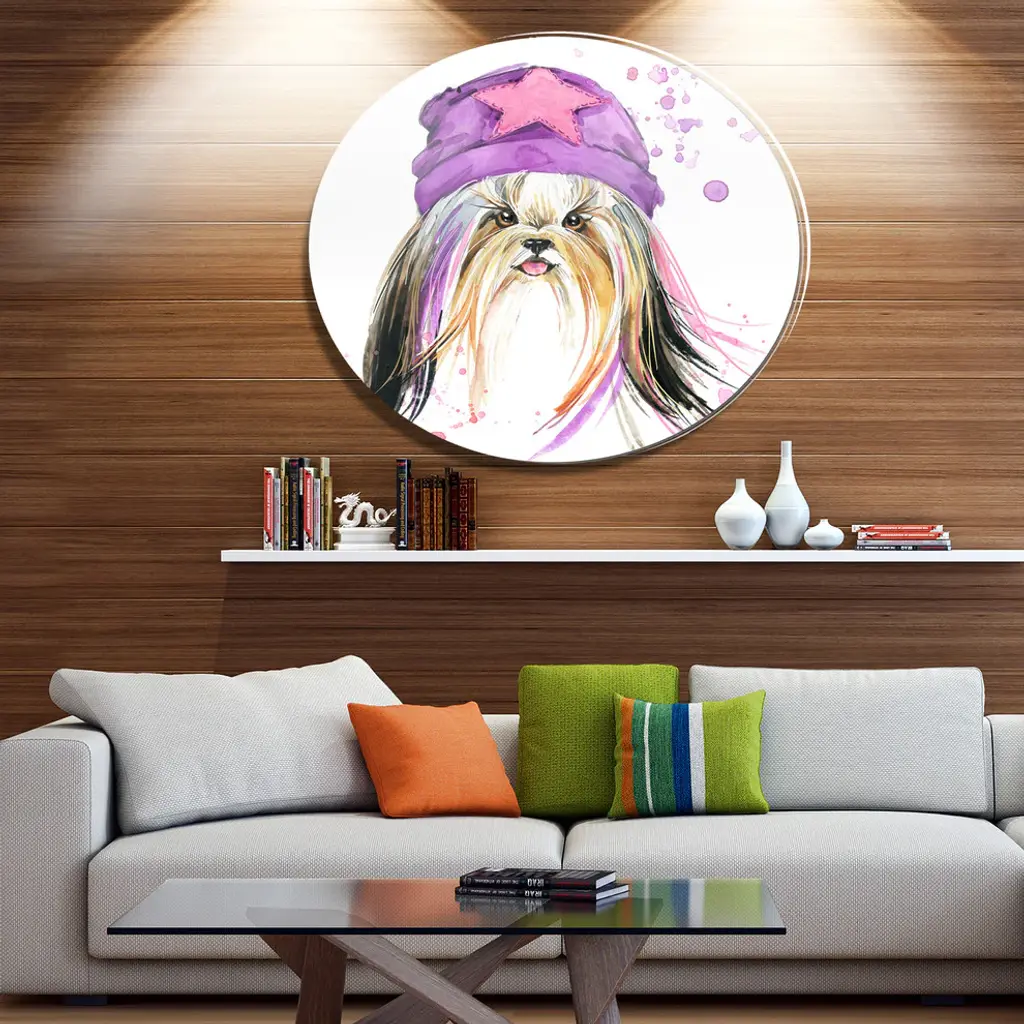 Bring Contemporary Abstraction to your home with this large Circle Metal wall art. This Stylish Puppy with Purple Hat Metal Artwork makes it the focal point of any room or office. - White Gloss Coating ensures colors are extra vibrant with light reflection.- Aluminum grade Sheet Metal with 1 inch mounting frame on the back giving the illusion that the artwork is floating on the wall..- Mounting Brackets are included along with instructions.- High Quality Digital images are created directly into a glossy aluminum panel producing a stunning and captivating print into the glossy finish of the metal.- Water, Fire and Scratch resistant HD Aluminum panels.- Looks better than any photo paper and guaranteed to last at least 20 years- Easy to clean with a microfiber cloth. Colors are far superior to regular Canvas Art. - Easy to Hang
