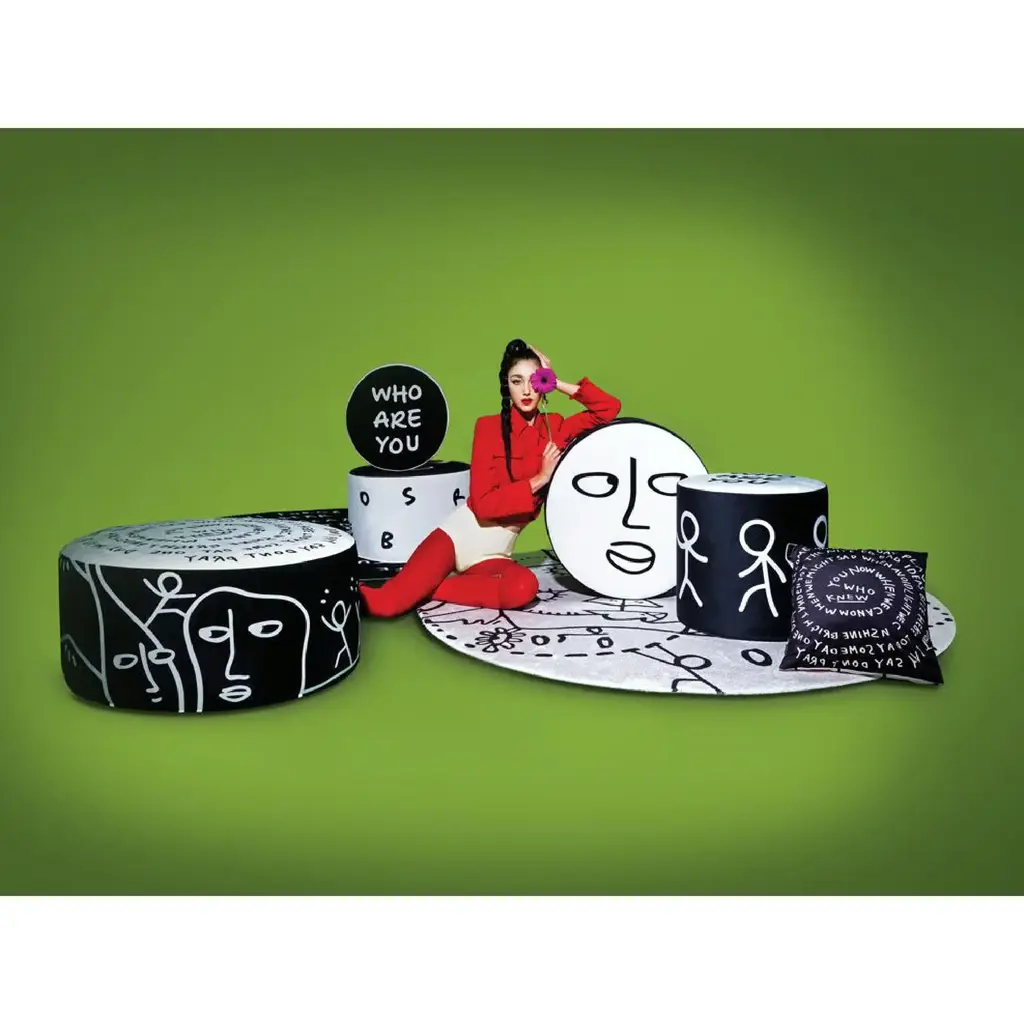 Introducing the Stylized Drawing Cylinder Pouf S from the Qeeboo Who Are You collection. Featuring unique graphics in black and white, these poufs add a touch of sophistication to any space. Available in three sizes, these poufs are not just stylish, they also provide comfortable seating. Elevate your home decor with these exclusive poufs.
