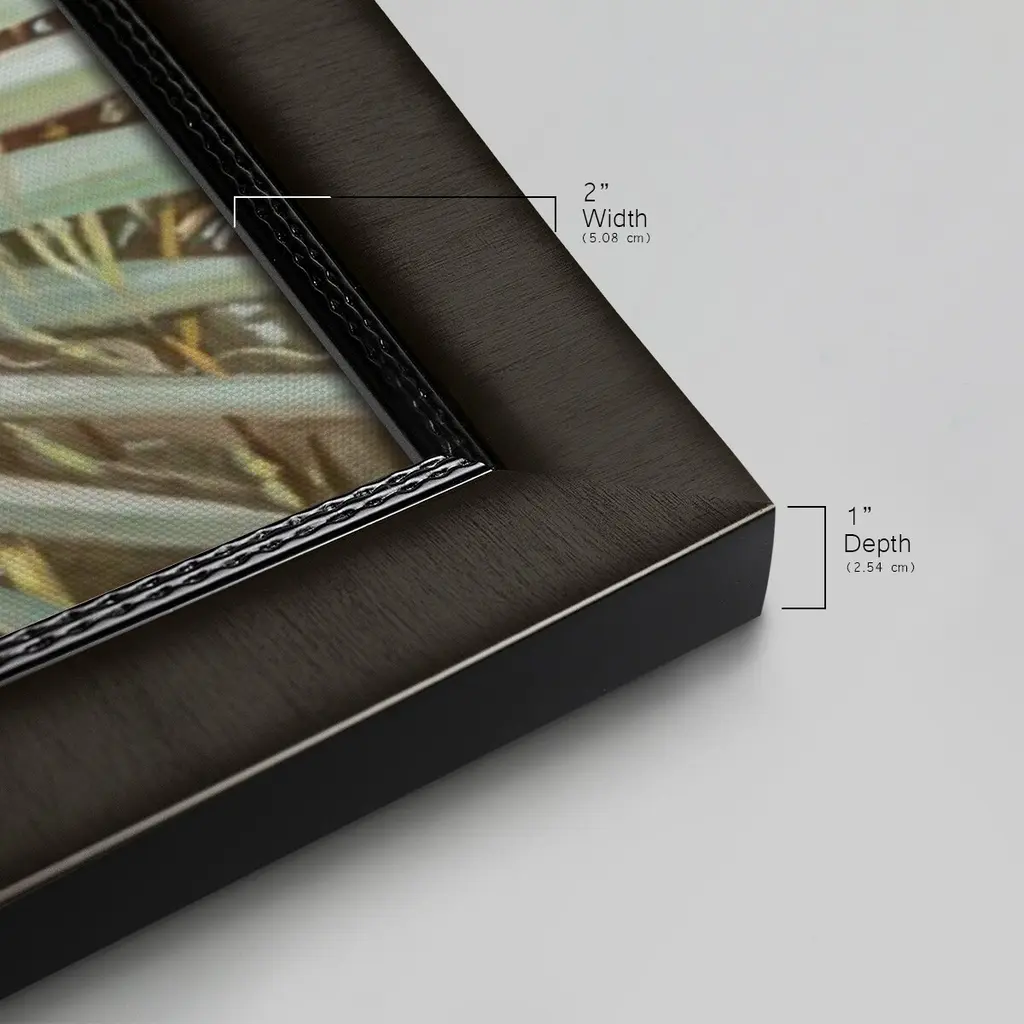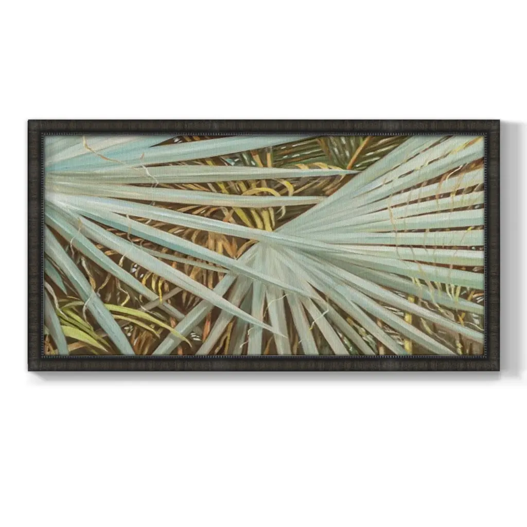 Suave Fronds Premium Framed Canvas- Ready to Hang A Premium Framed Canvas created to last. Framed in distressed wood and available in an array of sizes and colors Featuring a beveled a solid wood stretcher bar, each piece comes ready to hand 3 SIZES AVAILABLE 21''X37'' - Overall Size 25''X45'' - Overall Size 29''x53'' - Overall Size Each piece is made to order. Each piece comes with hanging hardware. Made in the USA Ready to Hang Giclee Paper Print Acrylic Glass Beveled Matt Board