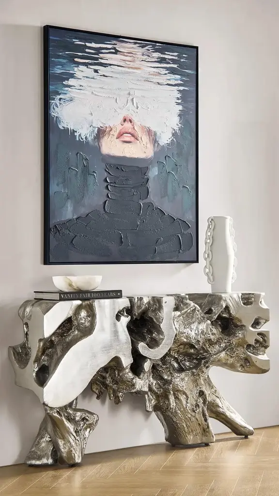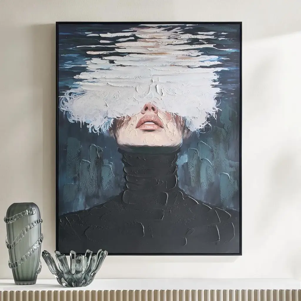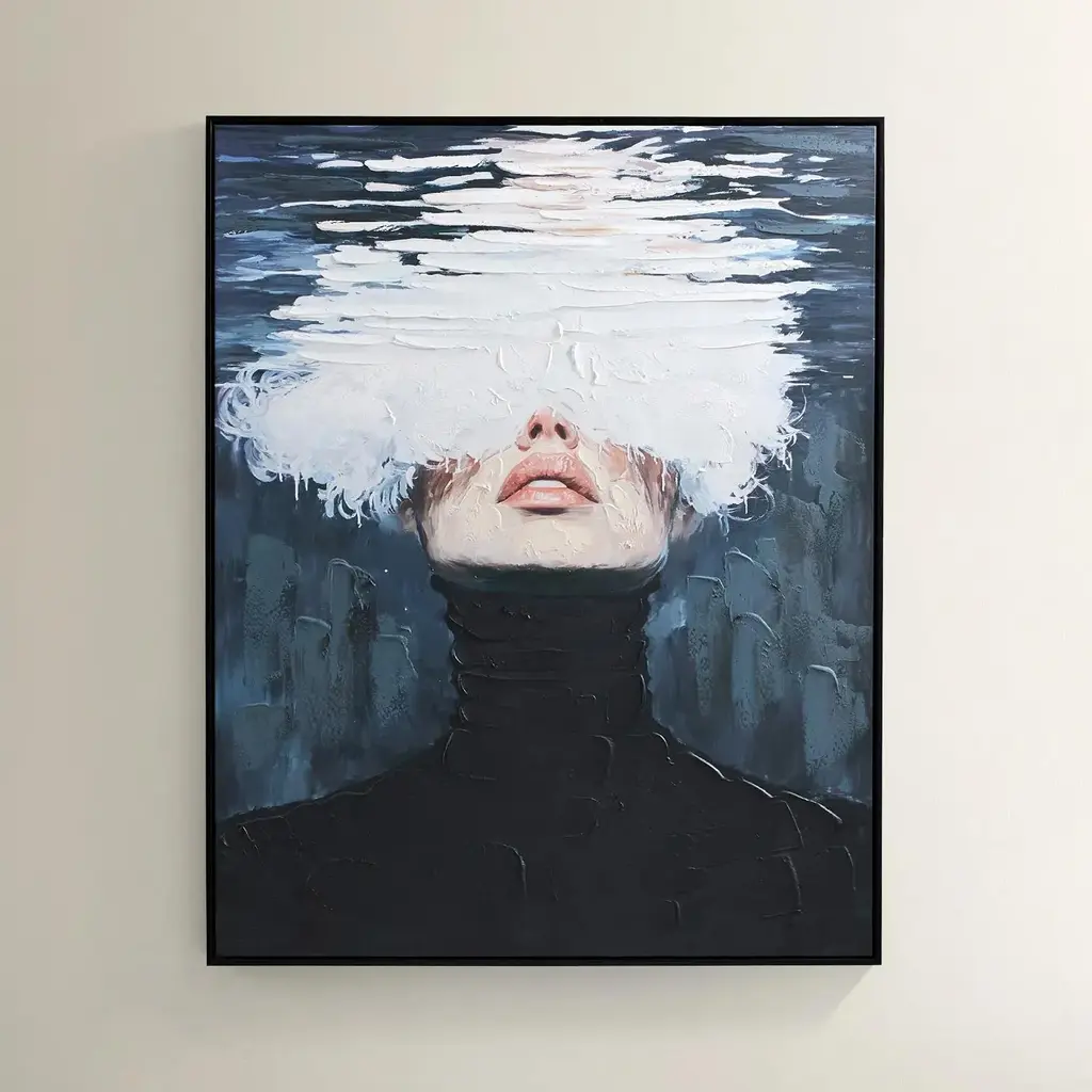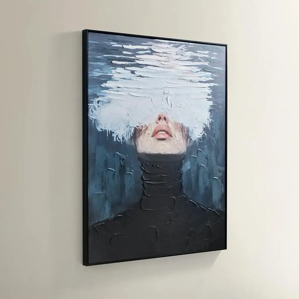 Dramatic and evocative, Submerged captures a surreal portrait of a woman dissolving into misty brushstrokes. The richly textured, hand-painted canvas creates striking dimension, while the black floater frame adds bold definition. A true conversation piece for modern interiors, this artwork brings moody sophistication to living rooms, bedrooms, or creative spaces.