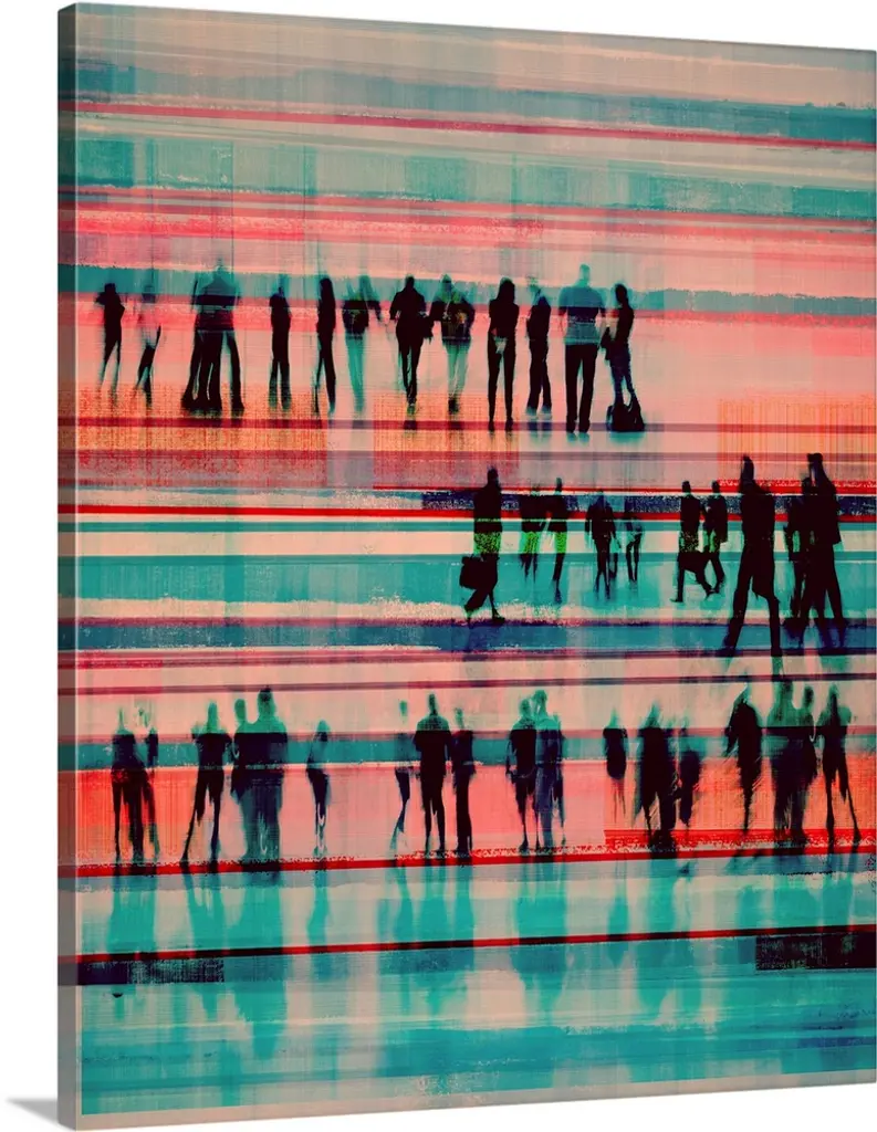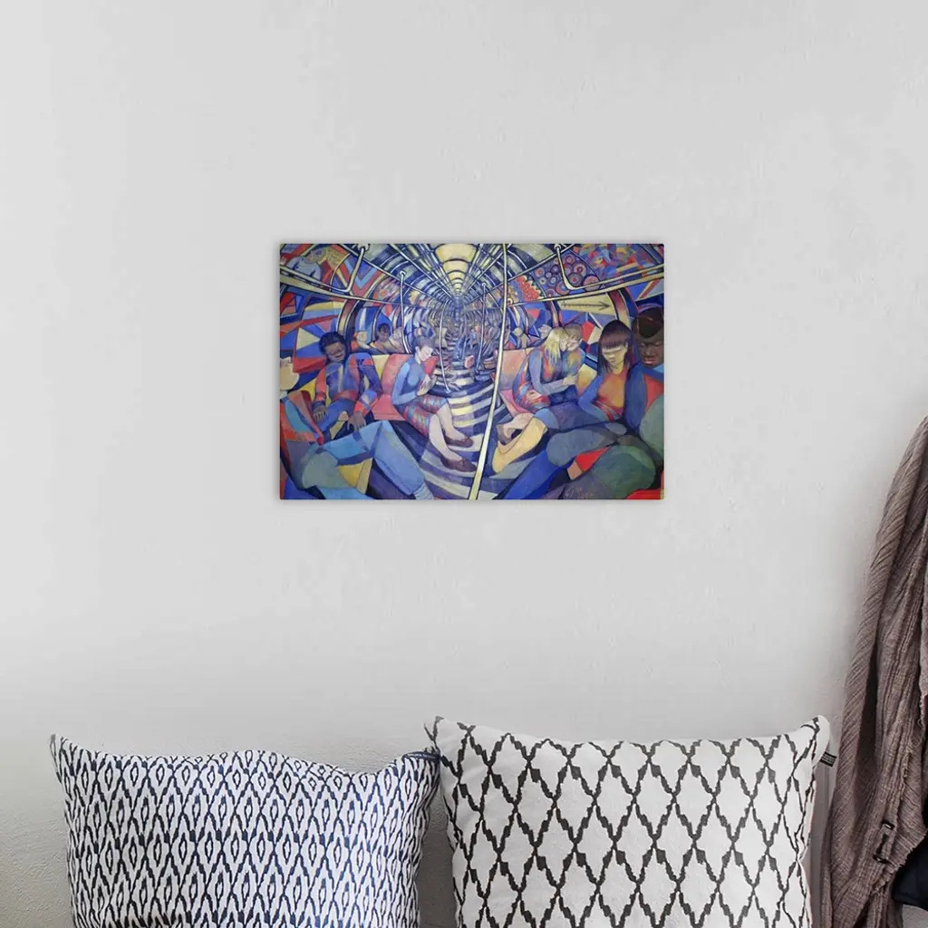 Contemporary abstract painting of underground train, metro, with commuters that are sleeping, resting, and kissing.