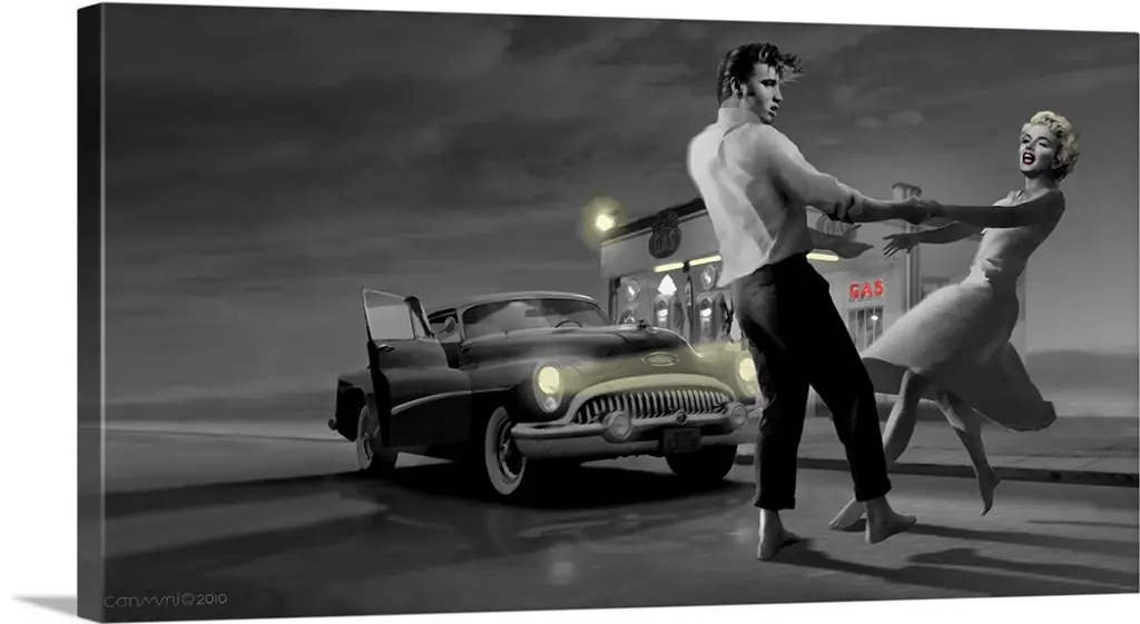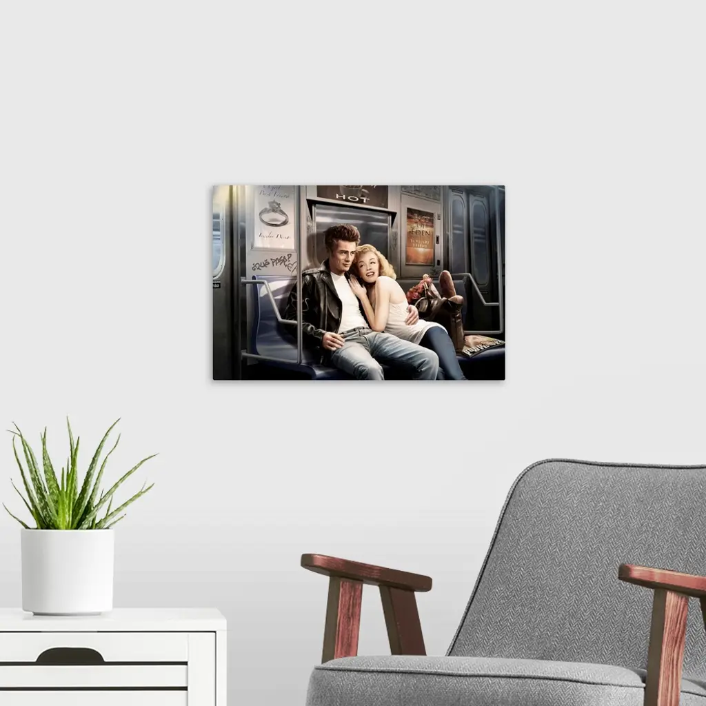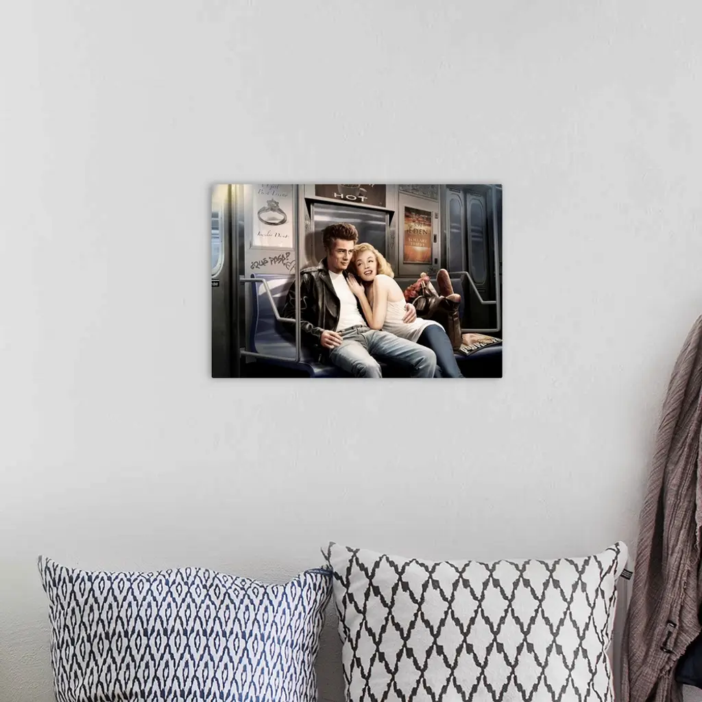 Digital art painting of Marilyn and James Dean on a subway ride by JJ Brando.