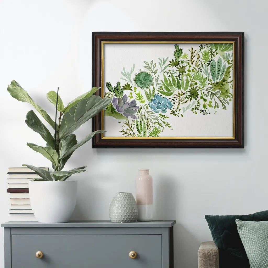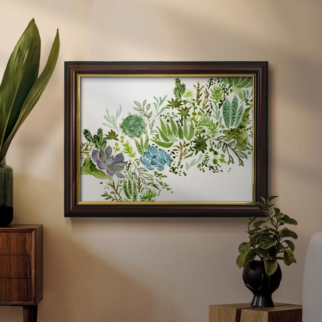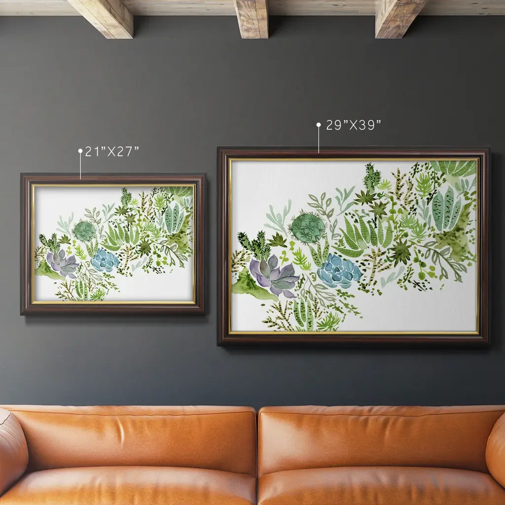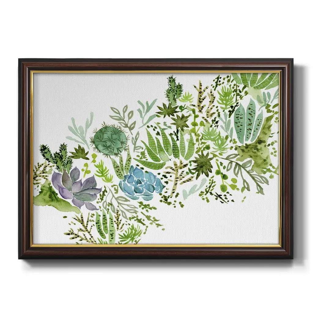 Succulent Field I Premium Framed Canvas- Ready to Hang A Premium Framed Canvas created to last. Framed in distressed wood and available in an array of sizes and colors Featuring a beveled a solid wood stretcher bar, each piece comes ready to hand 3 SIZES AVAILABLE 16''X20'' - Overall Size 18'X27'' - Overall Size 24''x36'' - Overall Size Each piece is made to order. Each piece comes with hanging hardware. Made in the USA Ready to Hang Giclee Paper Print Acrylic Glass Beveled Matt Board