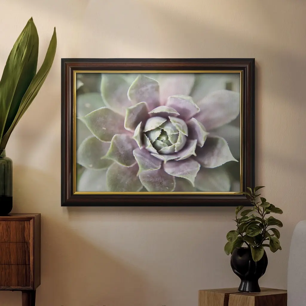 Succulent Glow II Premium Framed Canvas- Ready to Hang A Premium Framed Canvas created to last. Framed in distressed wood and available in an array of sizes and colors Featuring a beveled a solid wood stretcher bar, each piece comes ready to hand 3 SIZES AVAILABLE 16''X20'' - Overall Size 18'X27'' - Overall Size 24''x36'' - Overall Size Each piece is made to order. Each piece comes with hanging hardware. Made in the USA Ready to Hang Giclee Paper Print Acrylic Glass Beveled Matt Board