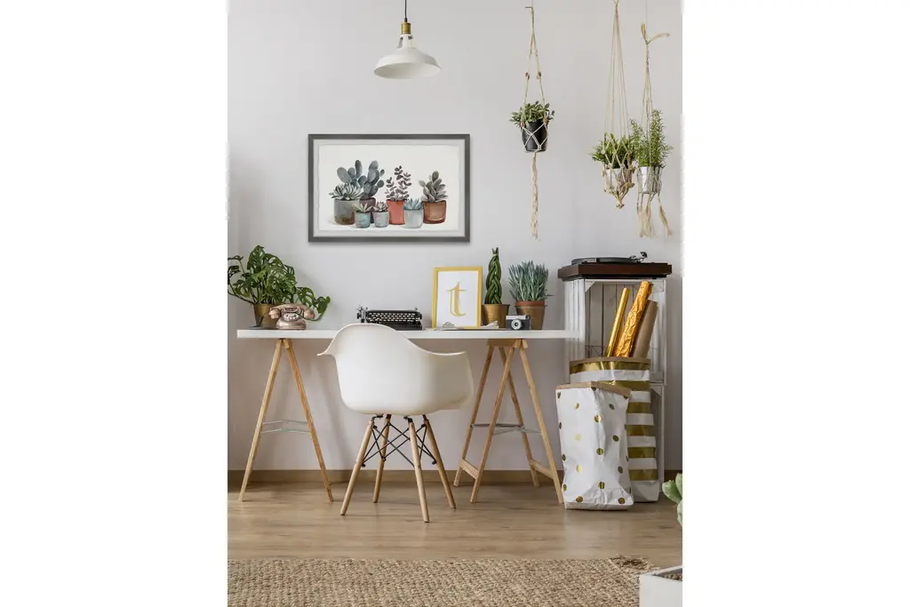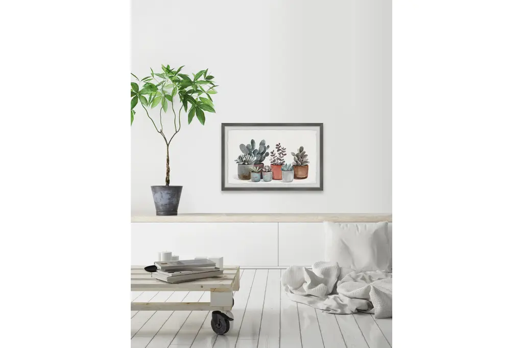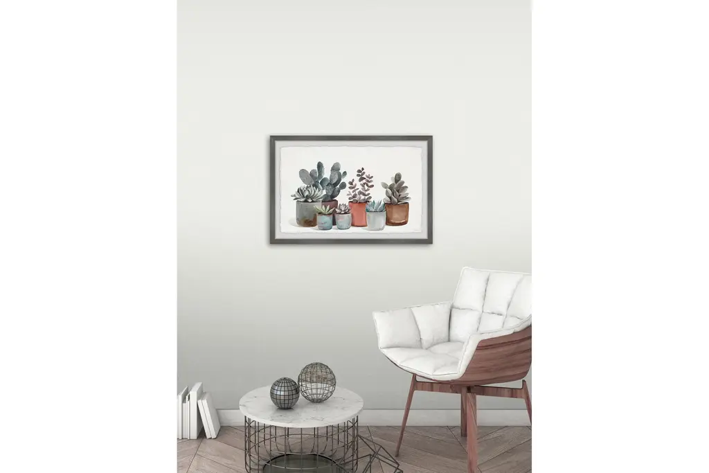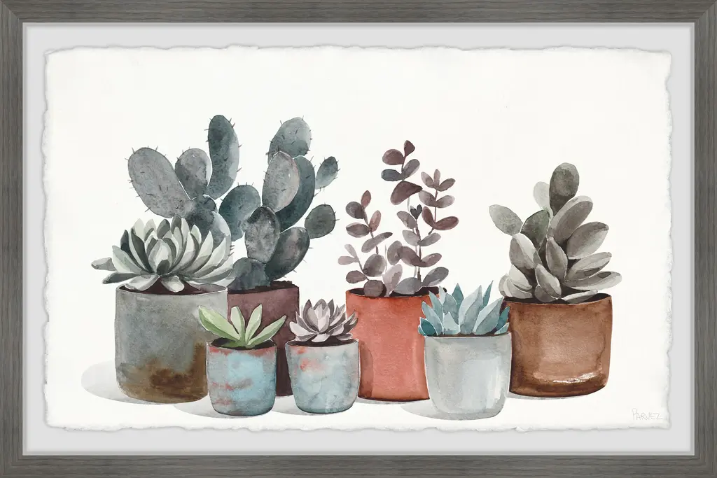 Make your space more eye-catching with this watercolor painting print that features various succulents in pots of different colors. Proudly printed in the USA, this piece is printed on high quality archive paper and professionally hand-framed. With wall-mounting hooks included, this artful accent is ready to hang up as soon as it reaches your front door.Canadian artist, Parvez Taj uses water paints, photographs, software, and UV cured inks to create his wall art. His artwork connects the out-of-reach luxury art world with the modern, fashion-conscious home decorator by delivering high quality artwork that is both affordable and hip.Top quality Giclee print on high resolution Archive PaperHand cut deckled edgesHigh quality durable non-warping frameFinished under shatter resistant plexiglassArrives ready to hangIncludes a certificate of authenticityPrinted in the USAArtist signature on the front