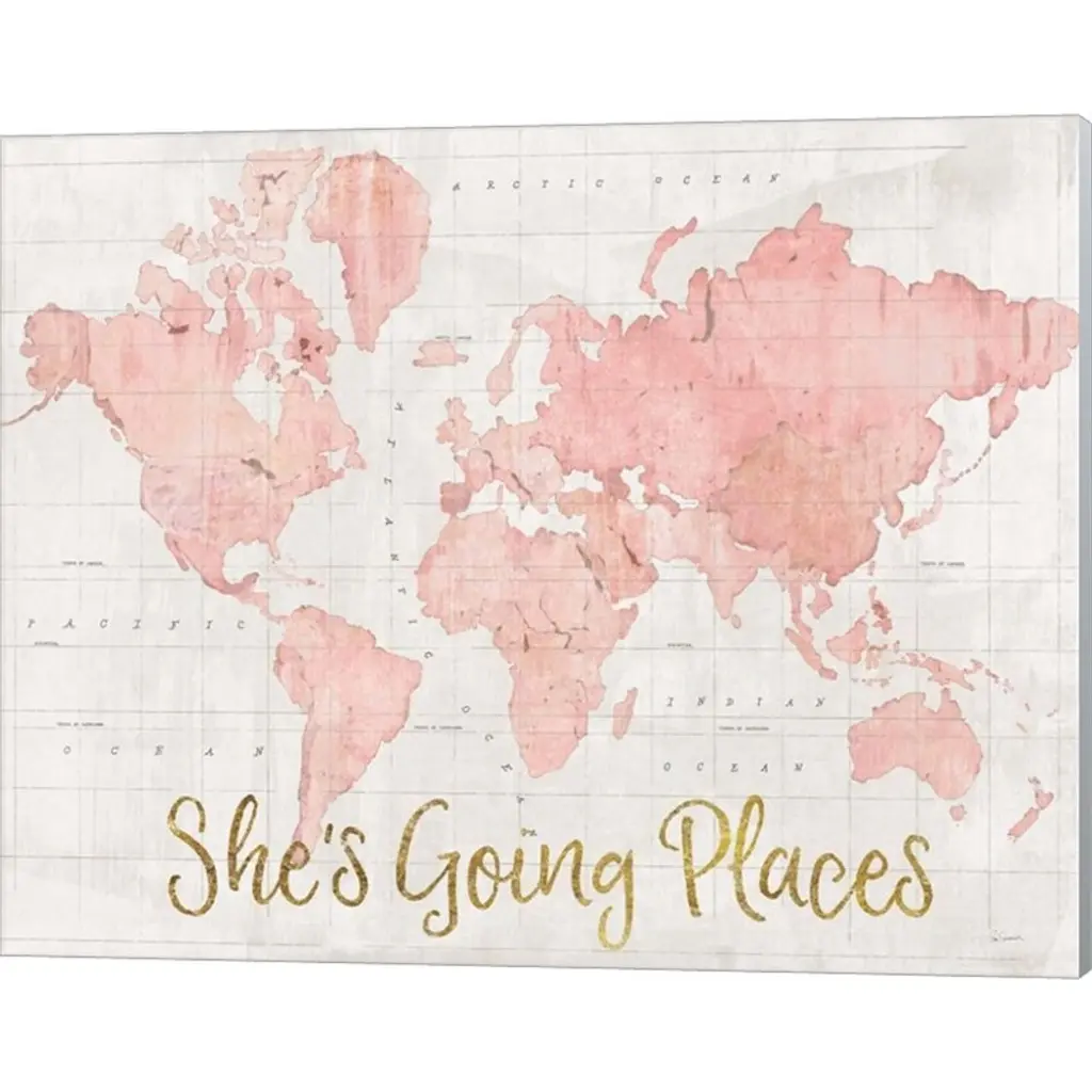 Across the World Shes Going Places Pink by Sue Schlabach is a high quality piece of canvas artwork. The finished size of this piece is 20" X 16", and it has a depth 0.75" with wintergray painted sides. There is a UV protective coating over the entire image, and it is ready to hang on your wall with no hardware required.