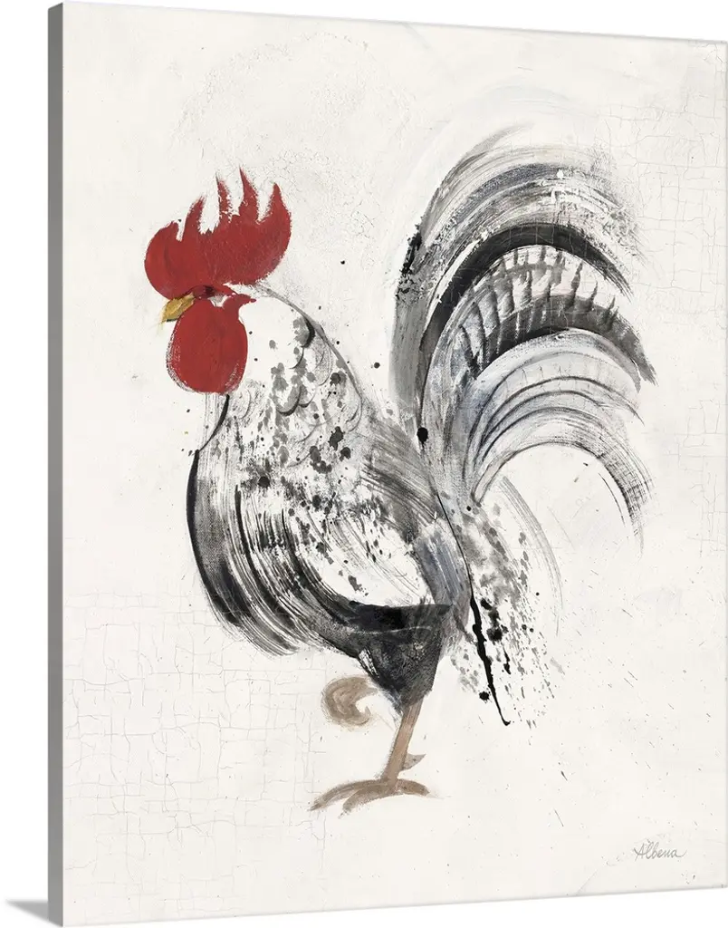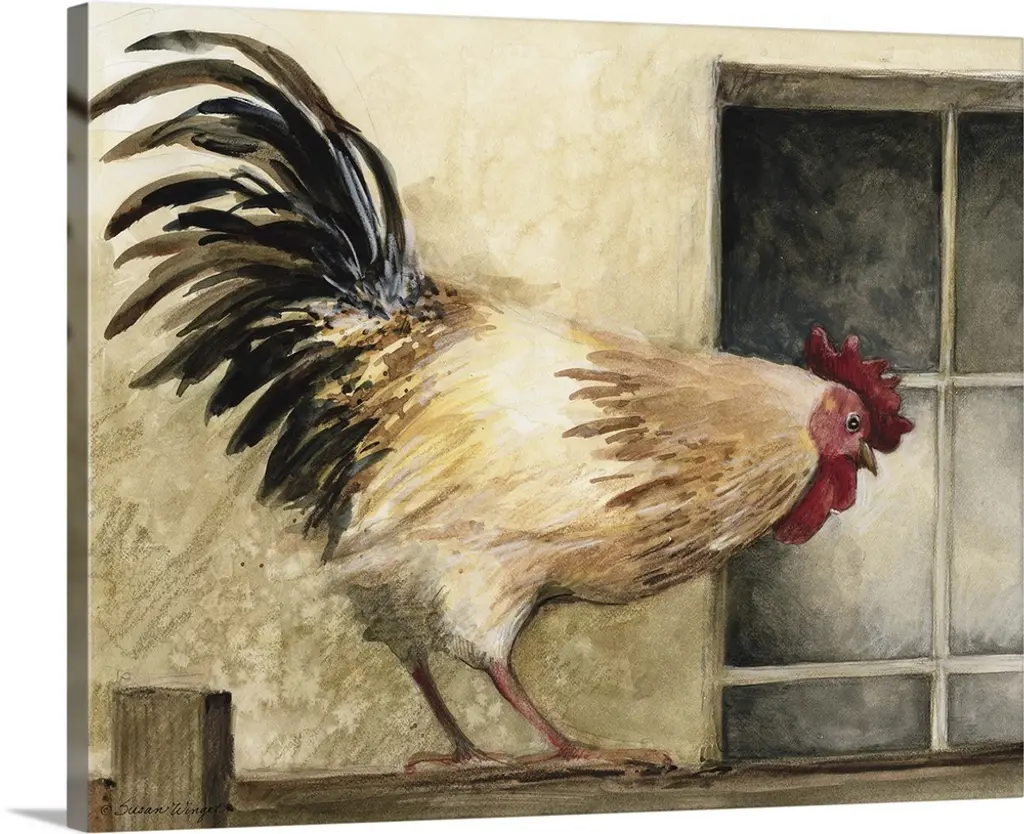 Cottage Rooster II by Sue Schlabach is a high quality piece of canvas artwork. The finished size of this piece is 12" X 12", and it has a depth 1.5". There is a UV protective coating over the entire image, and it is ready to hang on your wall with a standard drywall screw (not included). 100% Satisfaction Guaranteed.