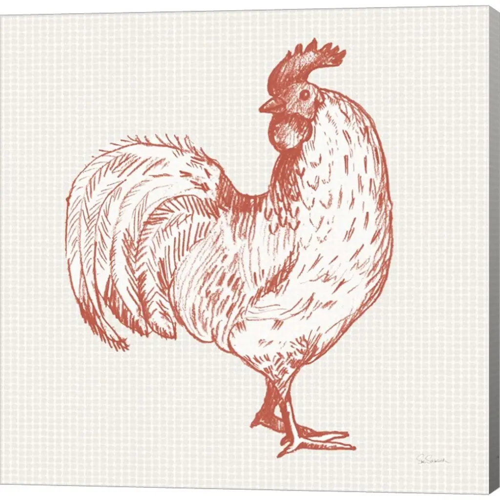 Cottage Rooster III Red by Sue Schlabach is a high quality piece of canvas artwork. The finished size of this piece is 12" X 12", and it has a depth 1.5". There is a UV protective coating over the entire image, and it is ready to hang on your wall with a standard drywall screw (not included). 100% Satisfaction Guaranteed.