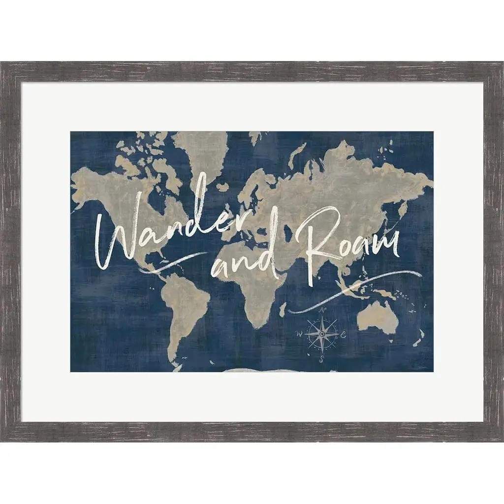 World Map Collage Deep Wander by Sue Schlabach is a high quality piece of framed artwork. The finished size of this piece is 24.5" X 18.5". It has a Rustic Grey Distressed frame, is single matted and finished with high quality Acrylic Plexiglass. 100% Satisfaction Guaranteed.