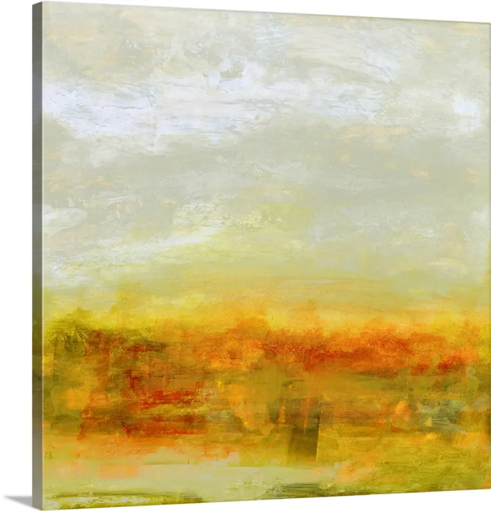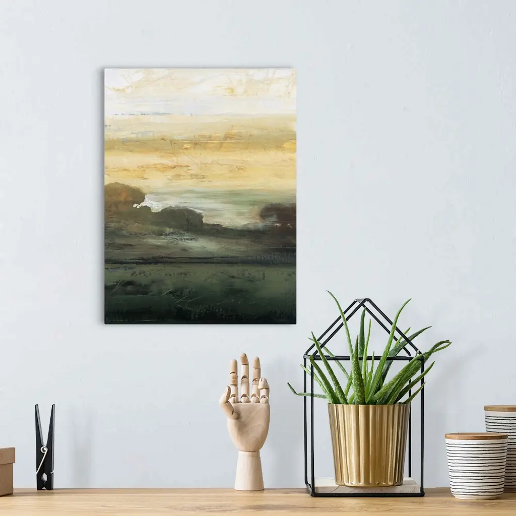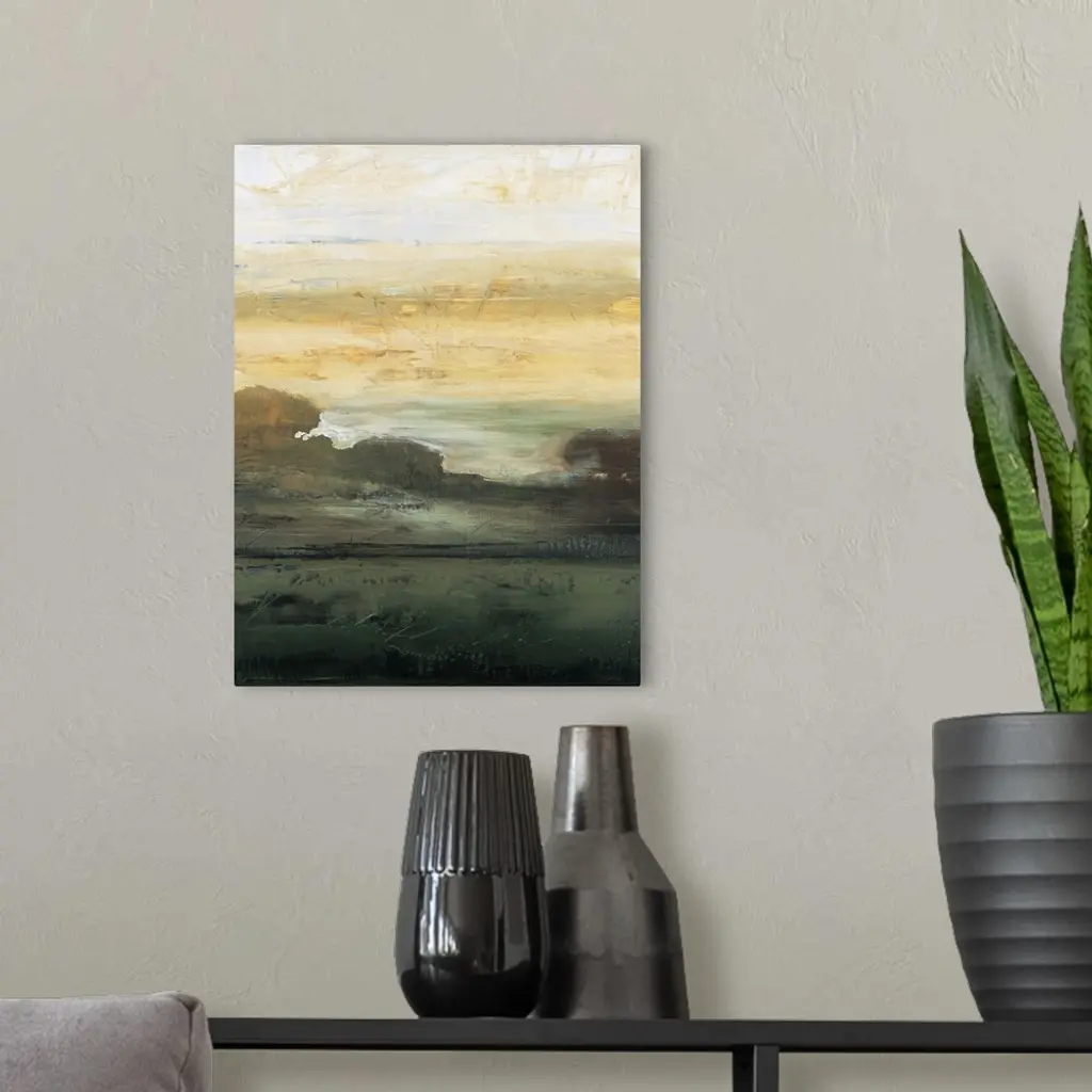 Contemporary abstract painting resembling a foggy landscape with a line of trees in the distance.