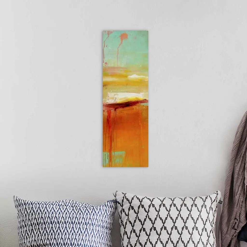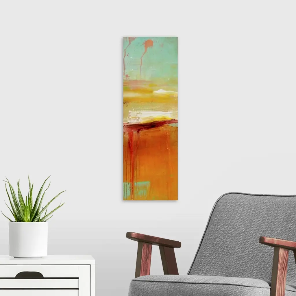 Giant, vertical abstract painting in an assortment of colors with smooth areas and some larger, brush stroked areas with splashes of paint and dripping.