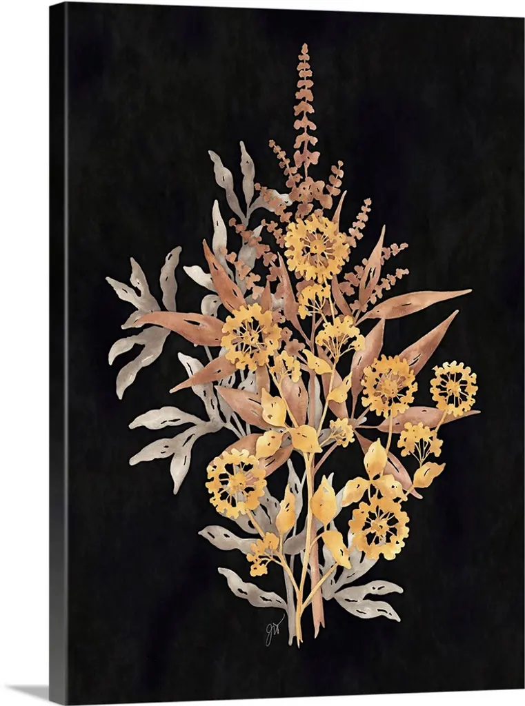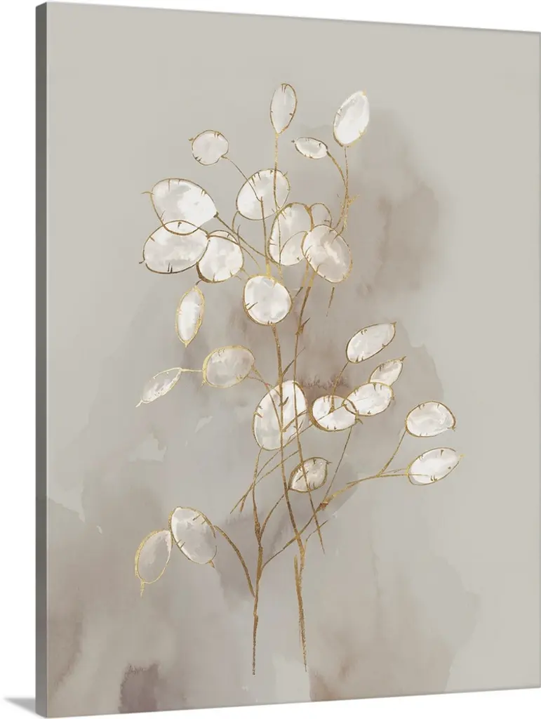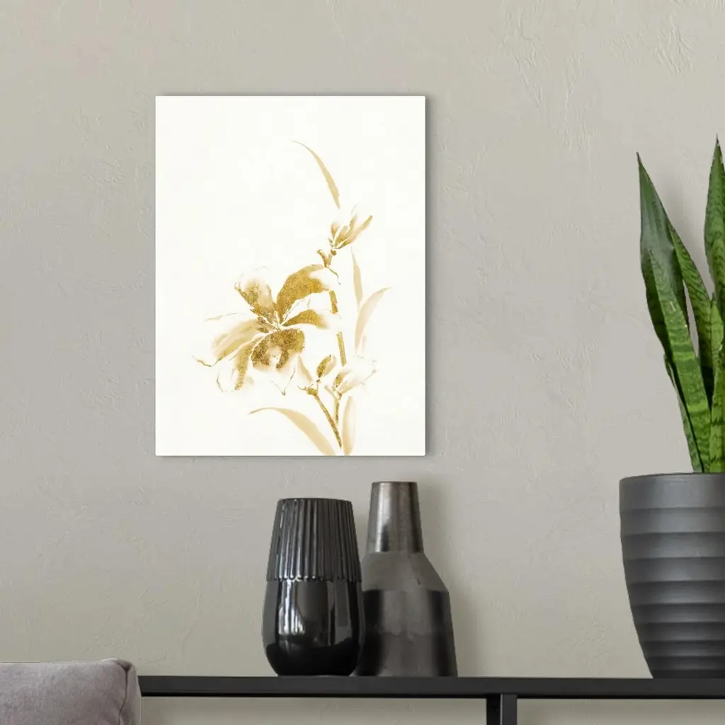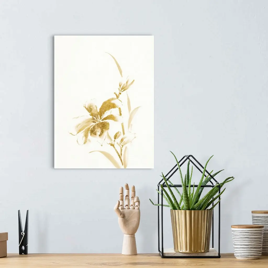 Vertical watercolor painting of a day lily in metallic gold against a white background.