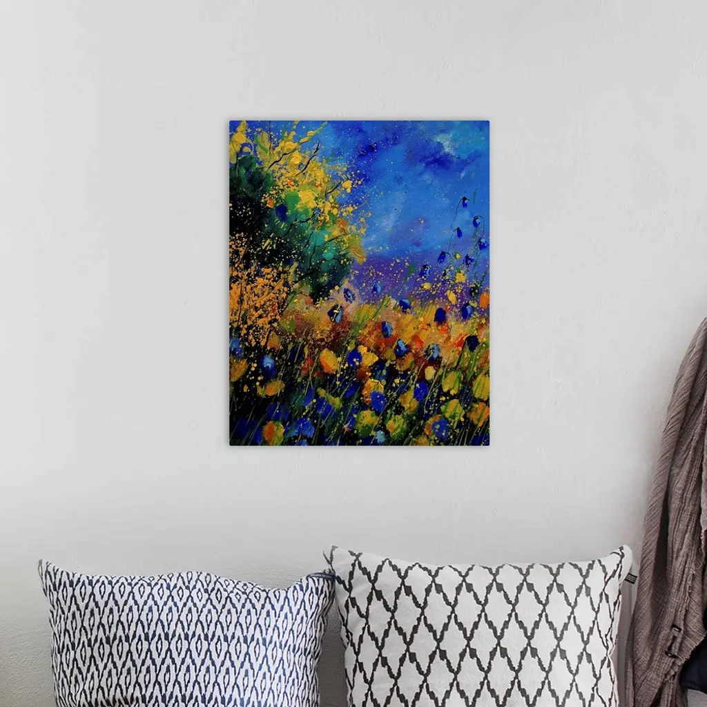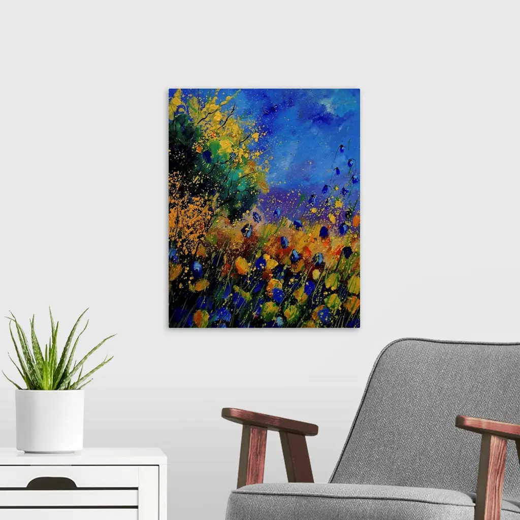 Vertical painting of a field of wild flowers with splatters of multi-color paint overlapping the image.
