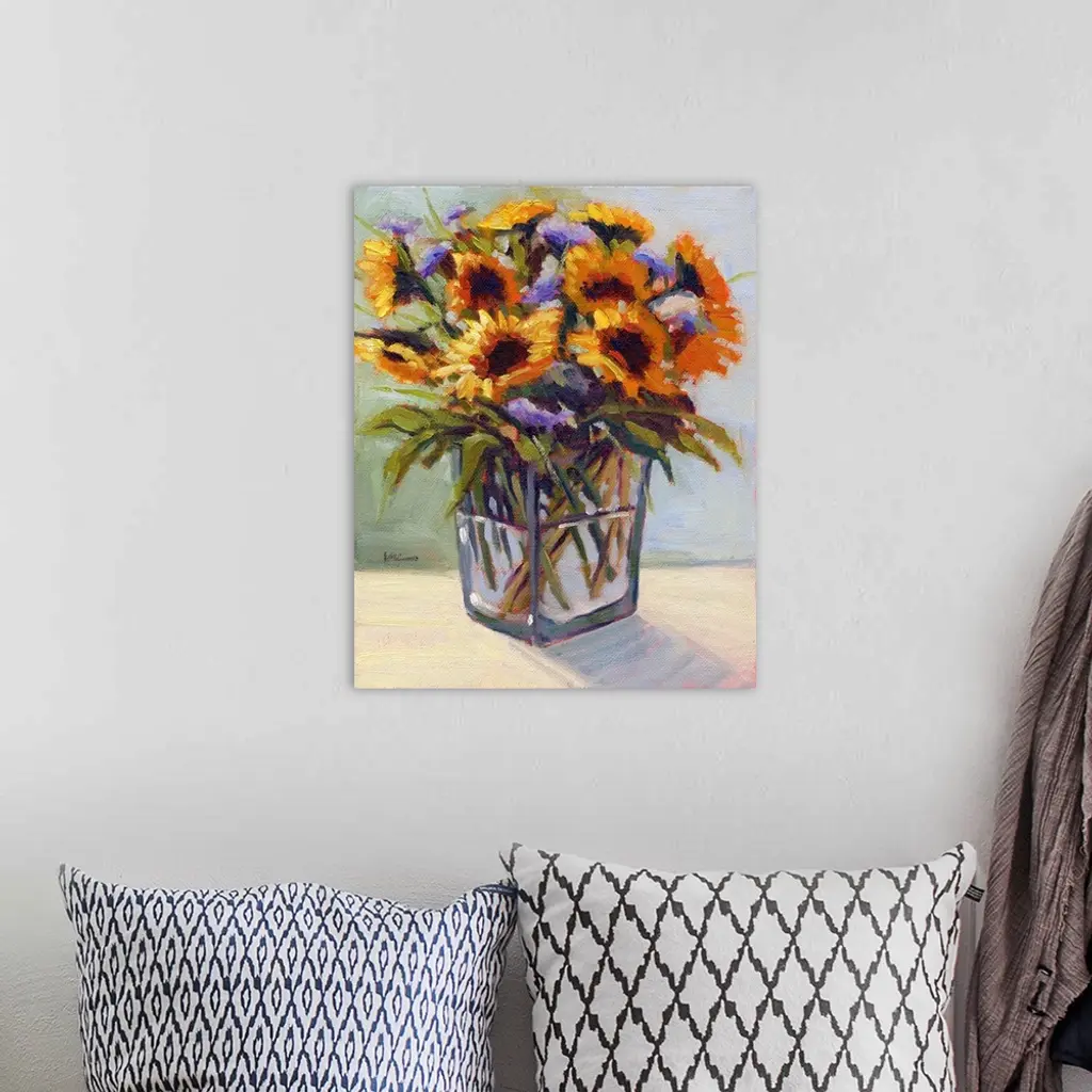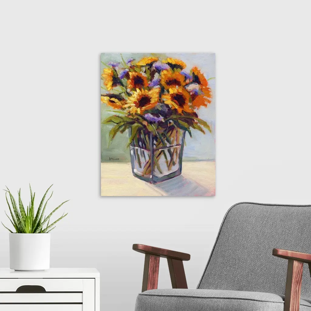 A vertical contemporary painting of a glass vase of eloquent summer flowers.