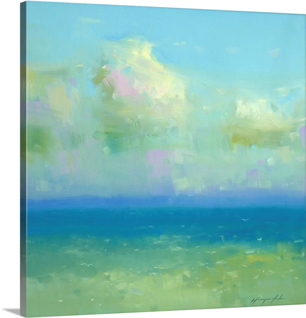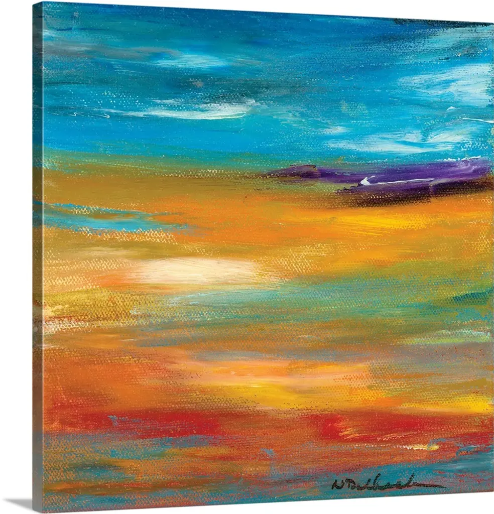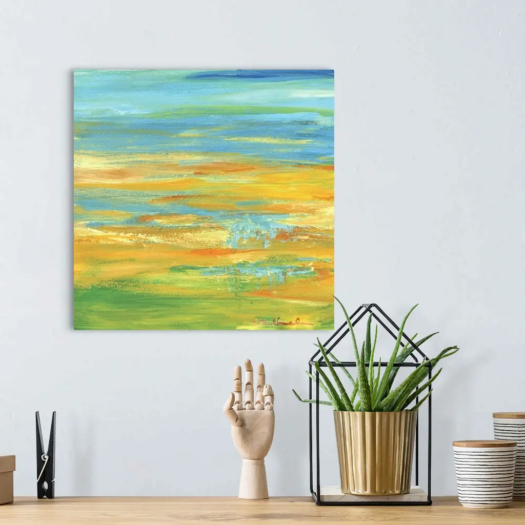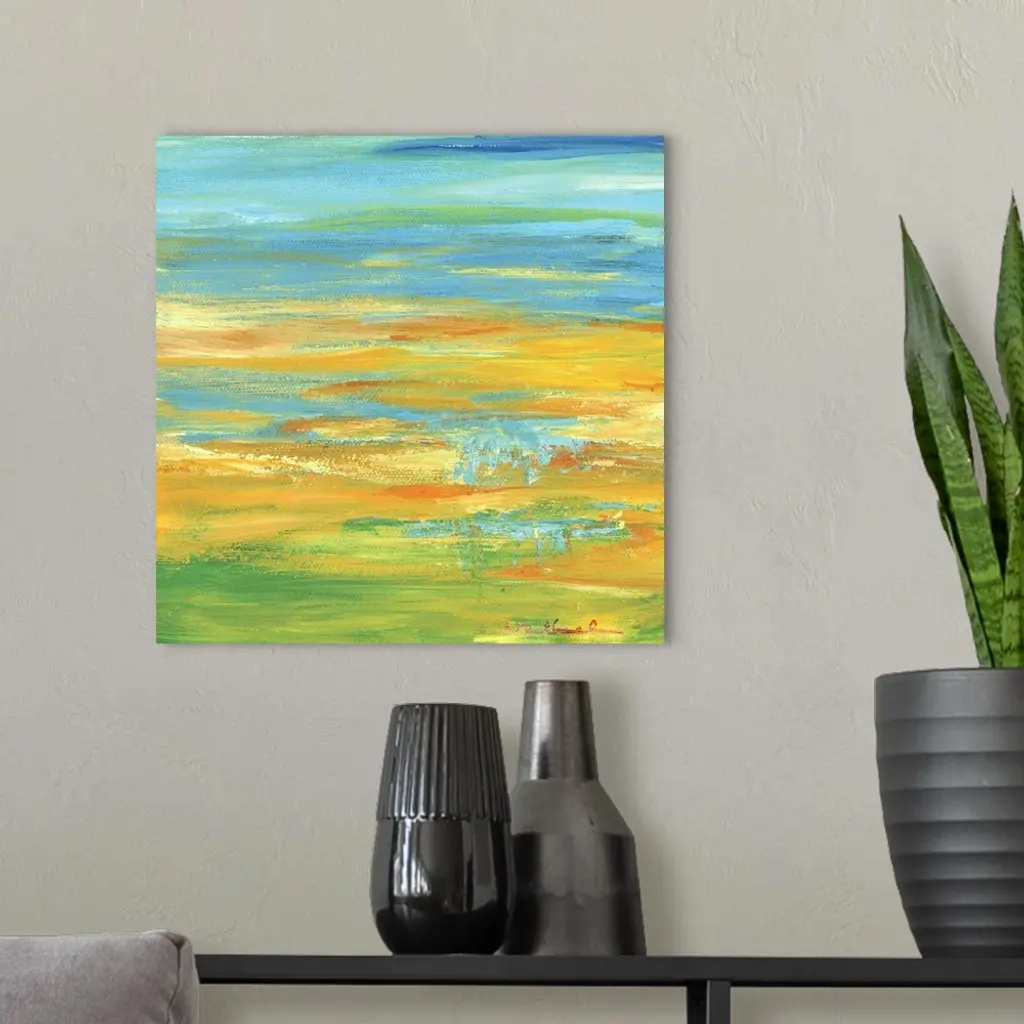 Square abstract painting in shades of orange, yellow, green, and blue resembling a Summer landscape.