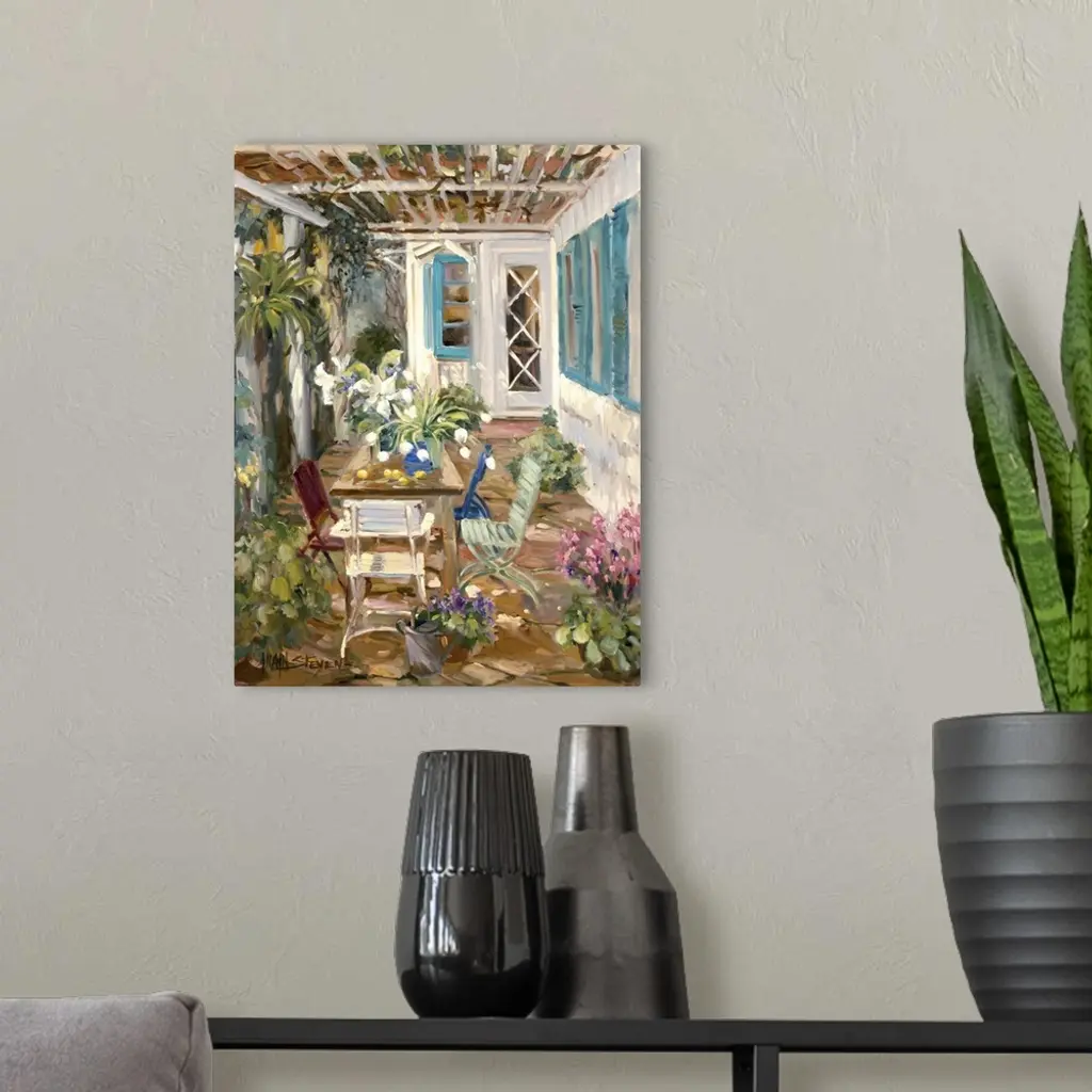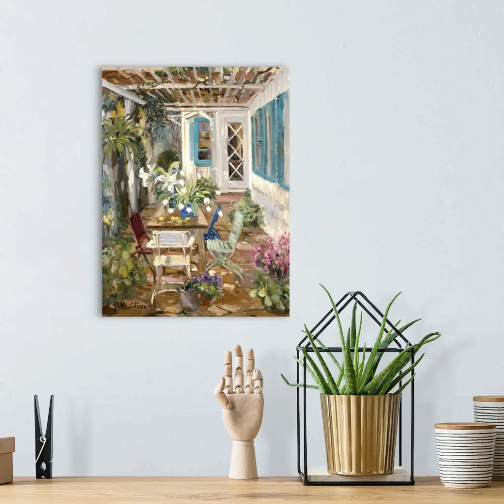 Fine art oil painting landscape of a back porch courtyard with flowers and plants by Allayn Stevens.