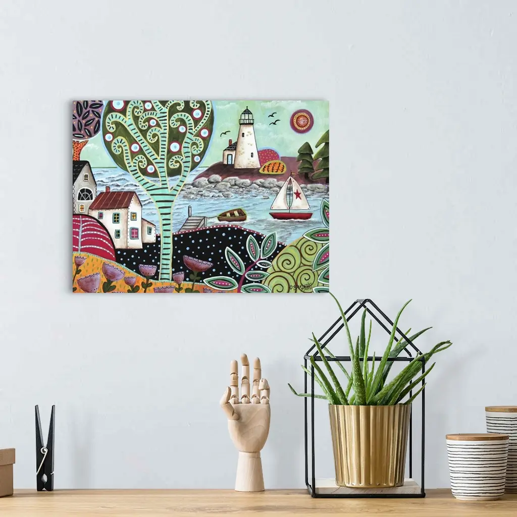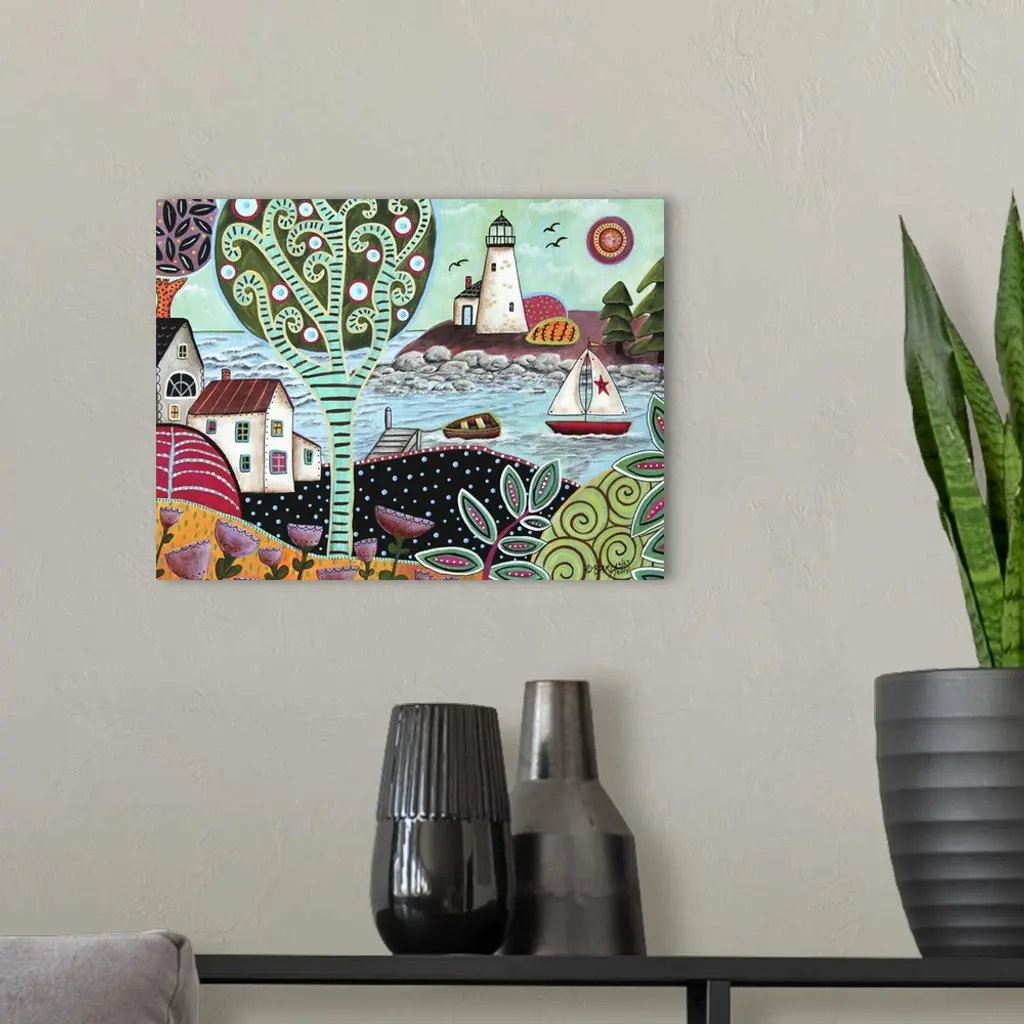 A contemporary folk art style painting of a rolling countryside landscape.