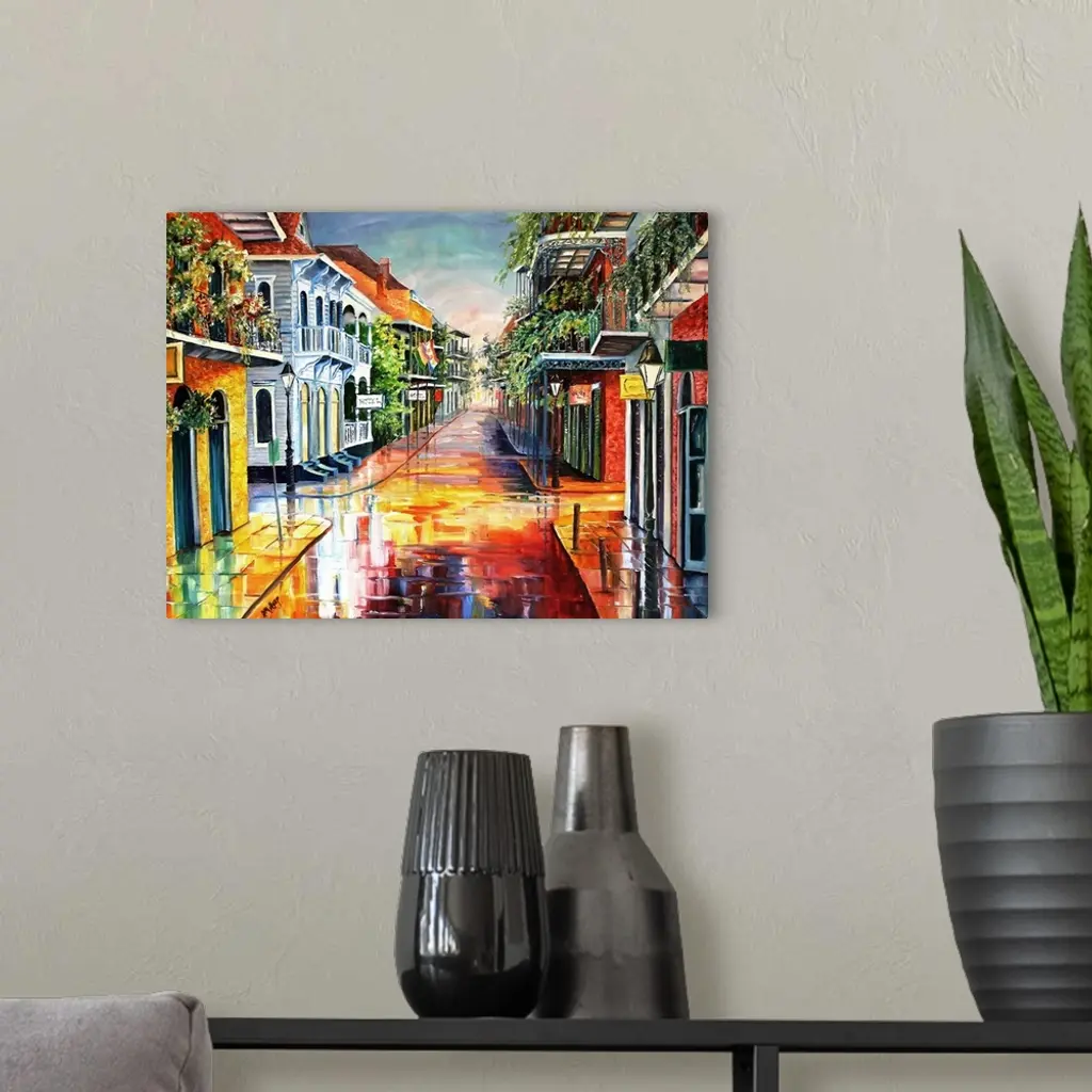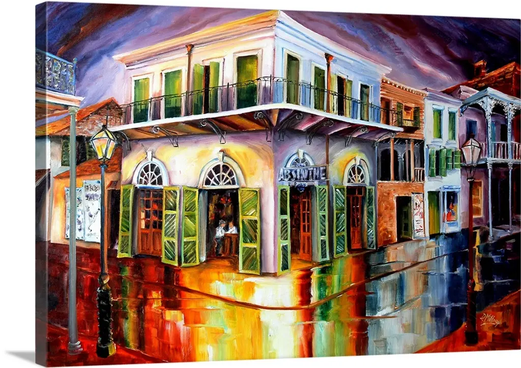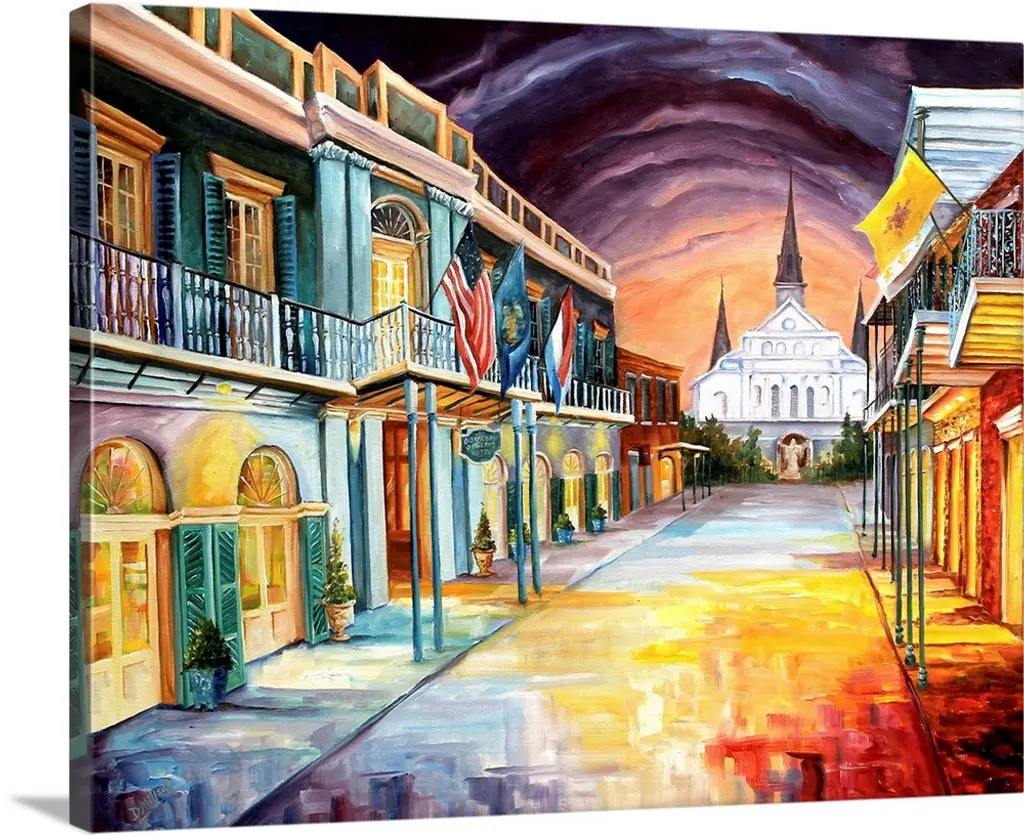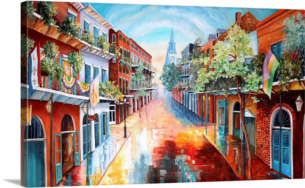 Vibrant contemporary painting of iconic landmarks in New Orleans in bright colors.