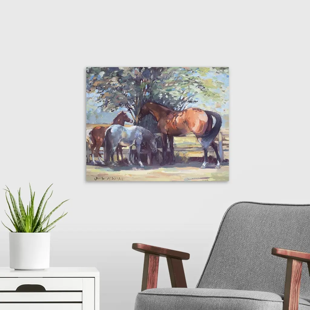 Contemporary painting of a horse and ponies in the shade in summer.