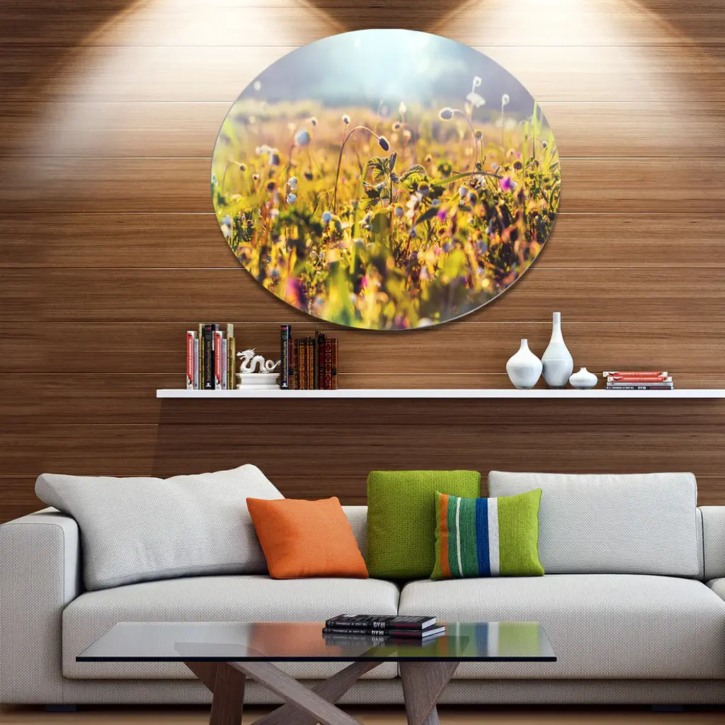Bring Contemporary Abstraction to your home with this large Circle Metal wall art. This Summer Flowers on Sunny Day Metal Artwork makes it the focal point of any room or office. - White Gloss Coating ensures colors are extra vibrant with light reflection.- Aluminum grade Sheet Metal with 1 inch mounting frame on the back giving the illusion that the artwork is floating on the wall..- Mounting Brackets are included along with instructions.- High Quality Digital images are created directly into a glossy aluminum panel producing a stunning and captivating print into the glossy finish of the metal.- Water, Fire and Scratch resistant HD Aluminum panels.- Looks better than any photo paper and guaranteed to last at least 20 years- Easy to clean with a microfiber cloth. Colors are far superior to regular Canvas Art. - Easy to Hang