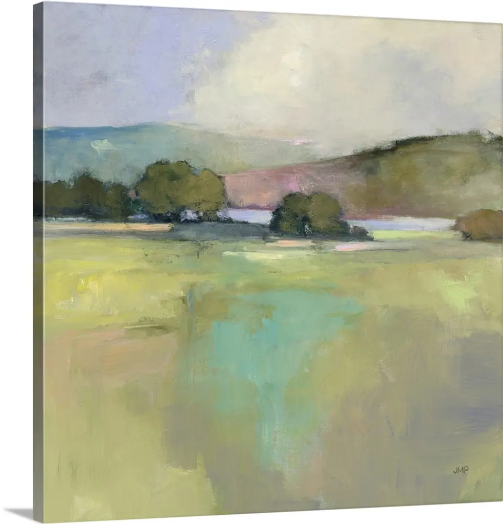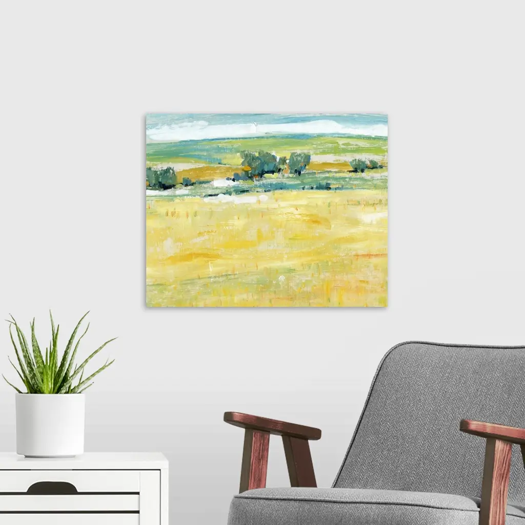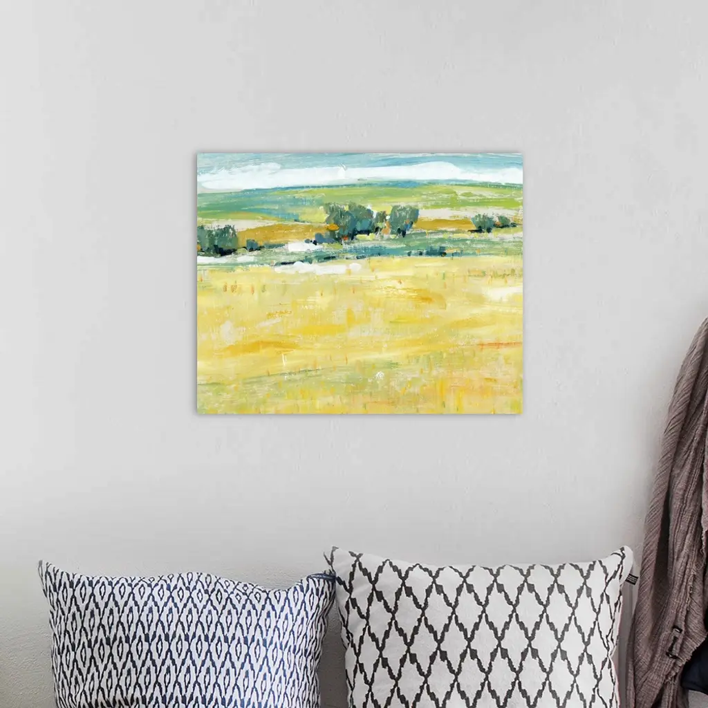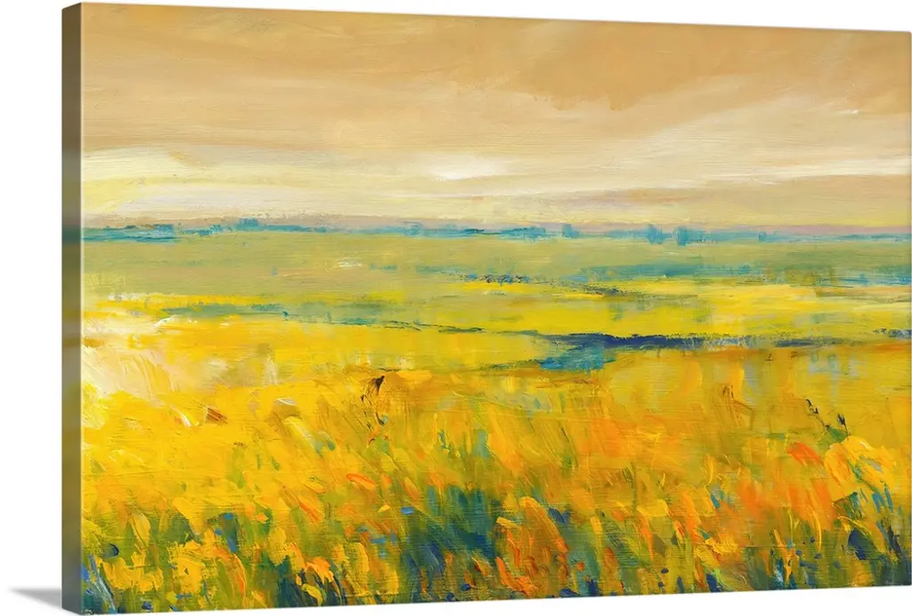 This contemporary artwork features long horizontal and short vertical brush strokes to create rolling yellow grasses against a countryside landscape.