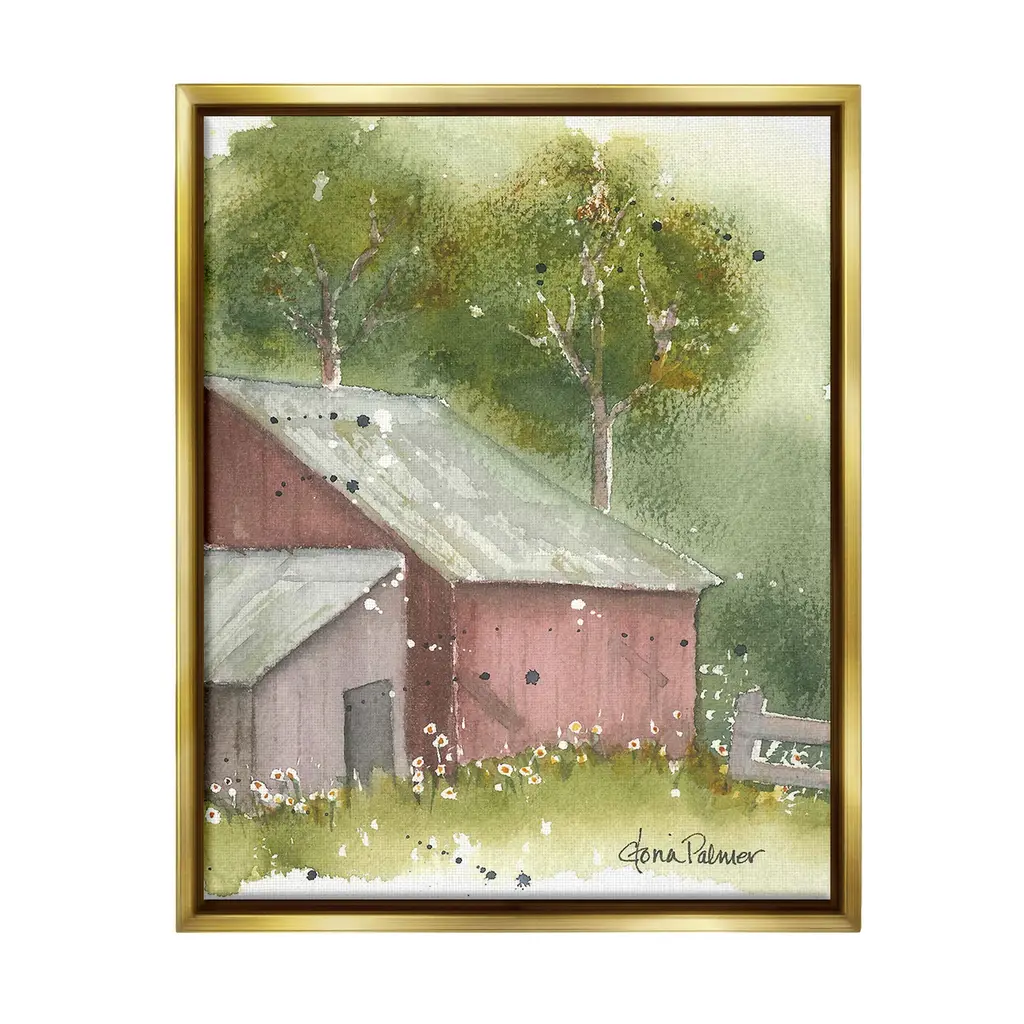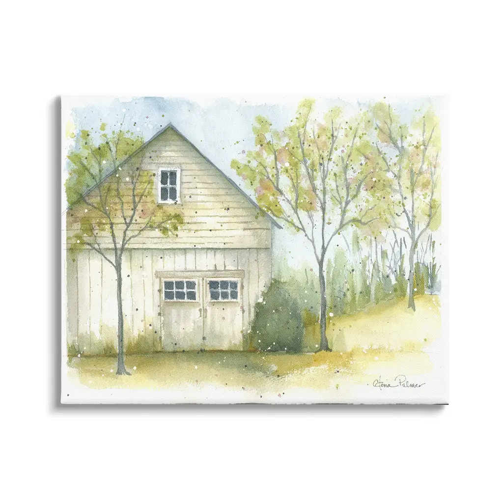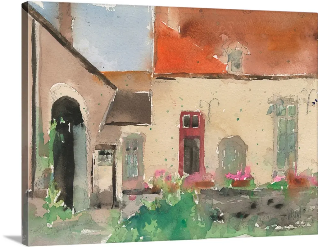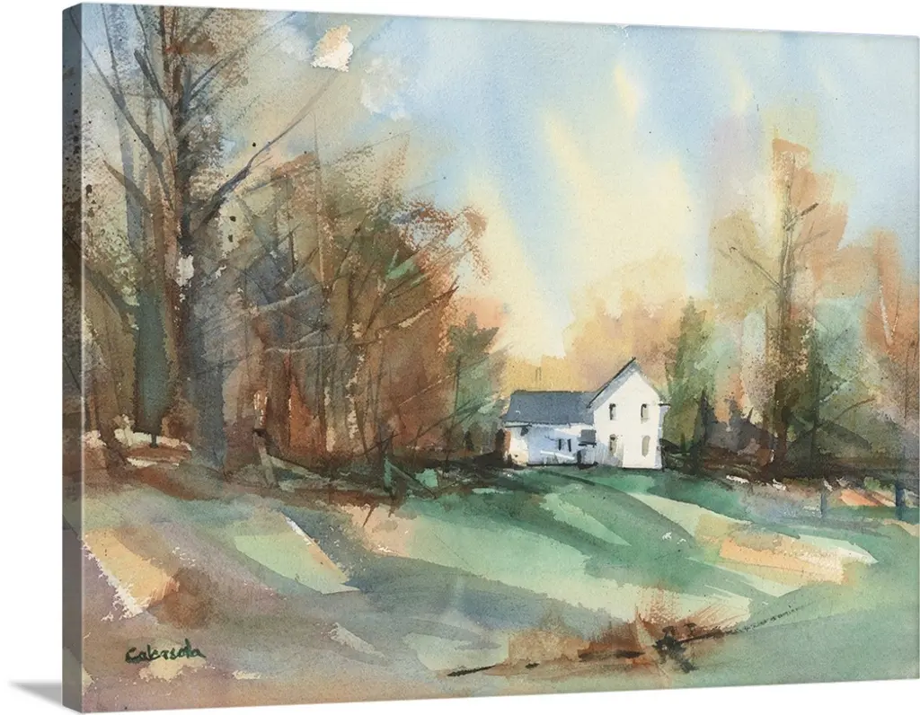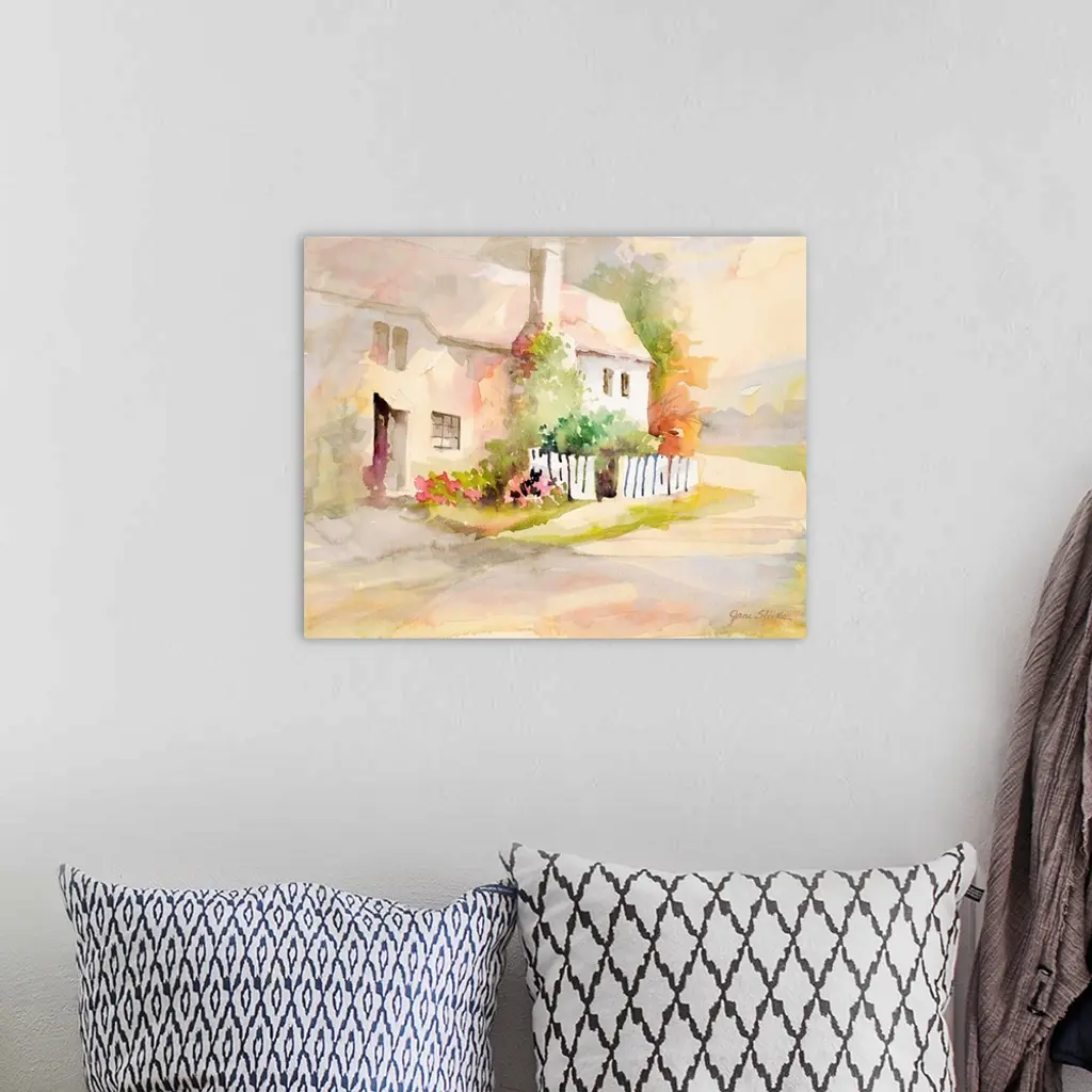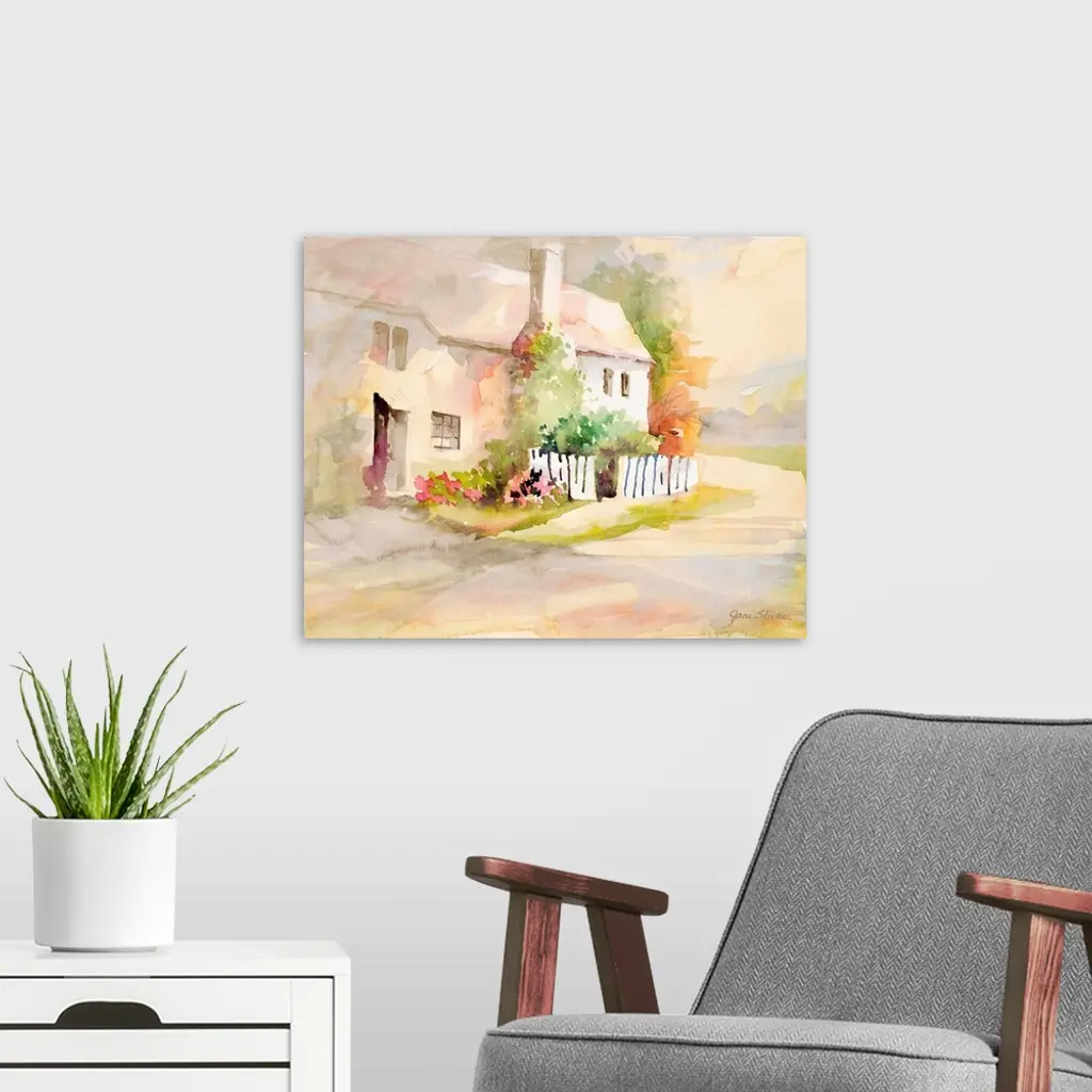 Contemporary watercolor painting of a countryside cottage with a white picket fence out front.