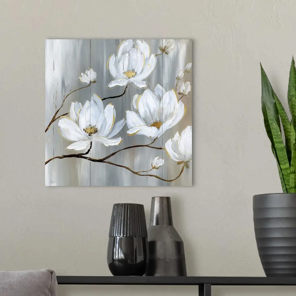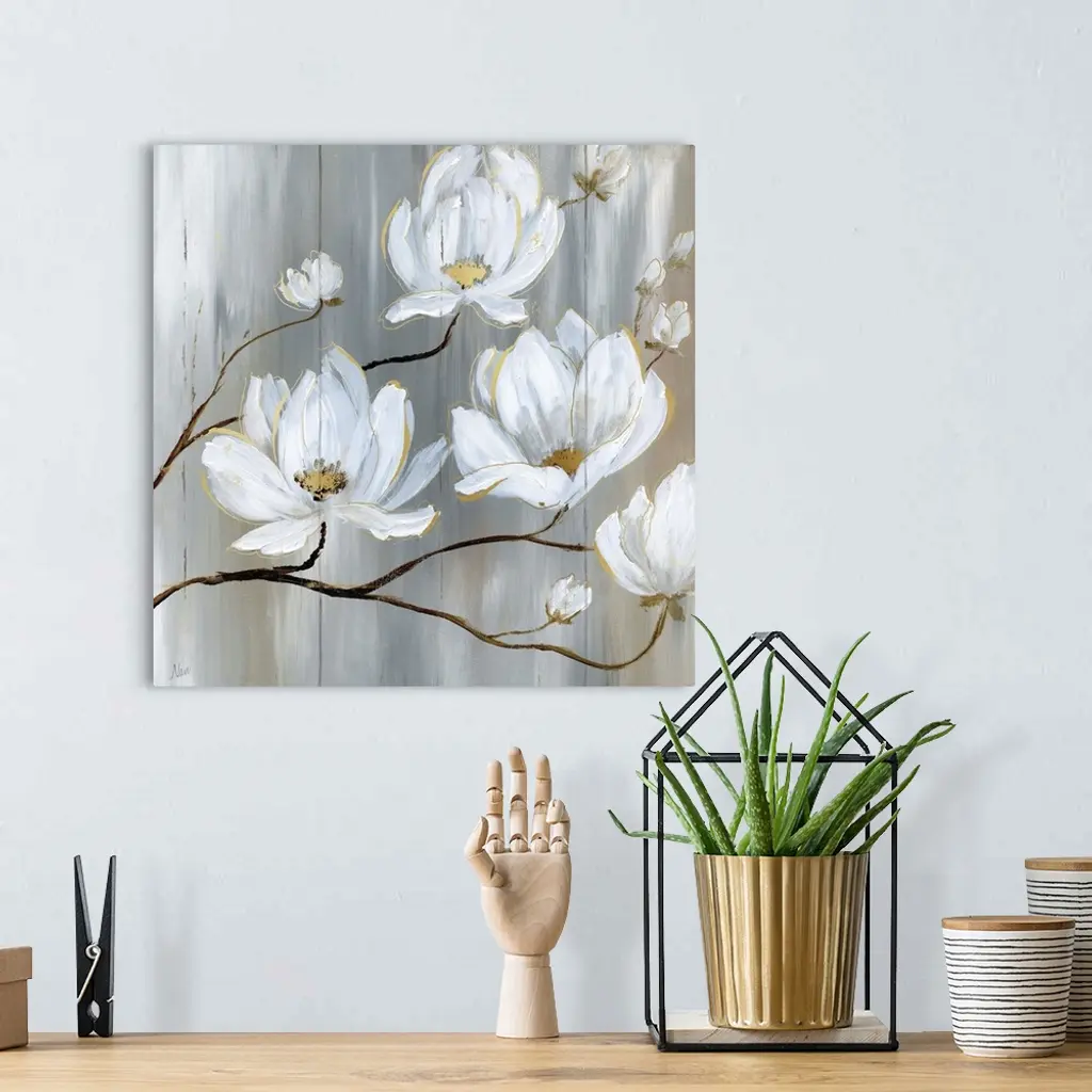 Contemporary painting of neutral colors with white flowers on a square backdrop resembling wood boards.