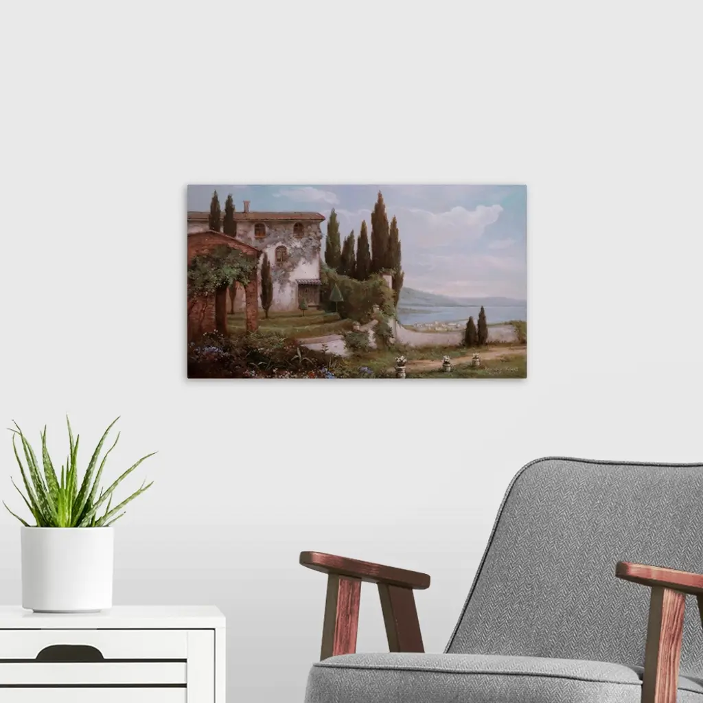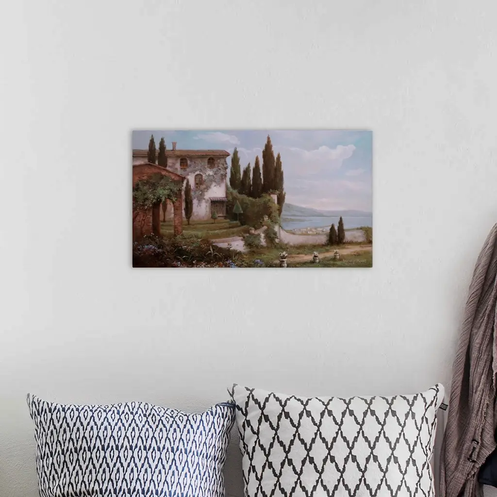 A very traditional style painting of a lakeside villa in Italy on a warm summers day