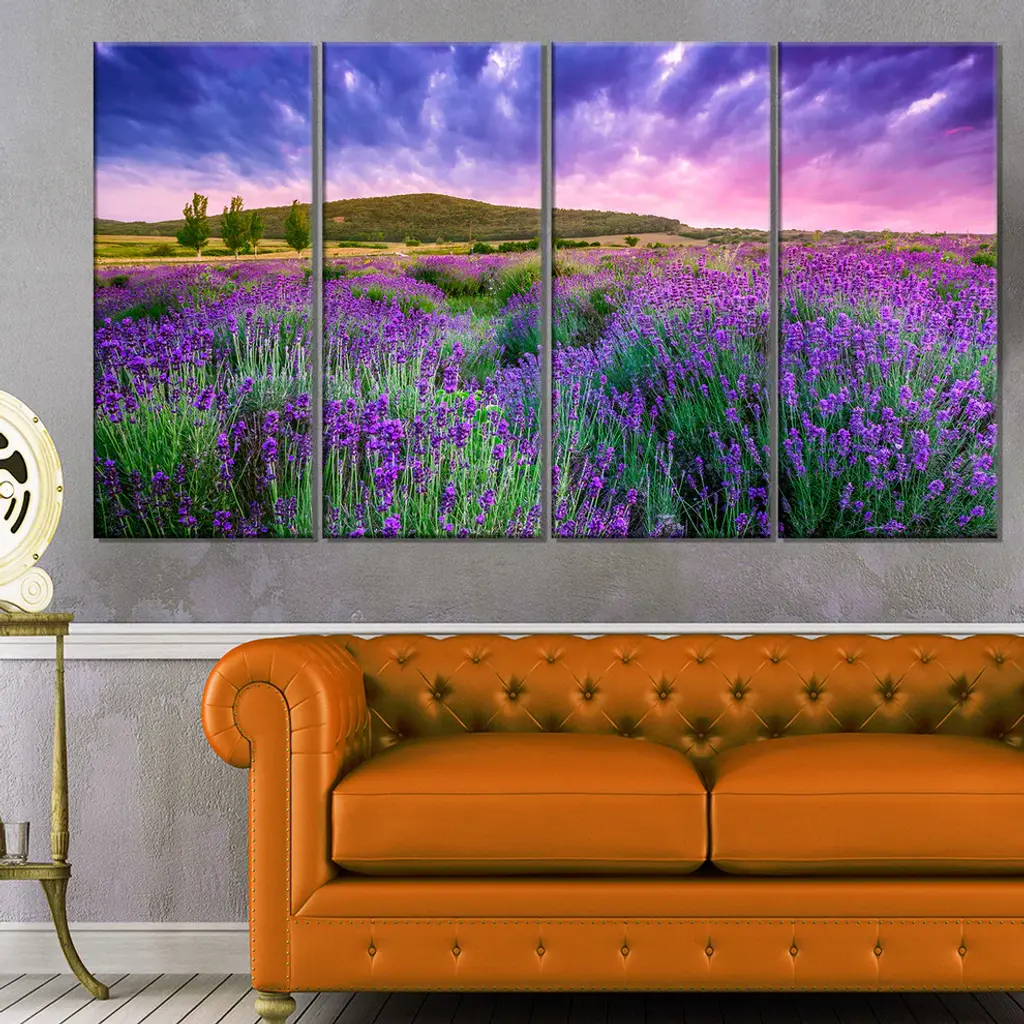 "Summer Lavender Field In Tihany" Modern Landscape Wall Art, 4 Panels, 48"x28"