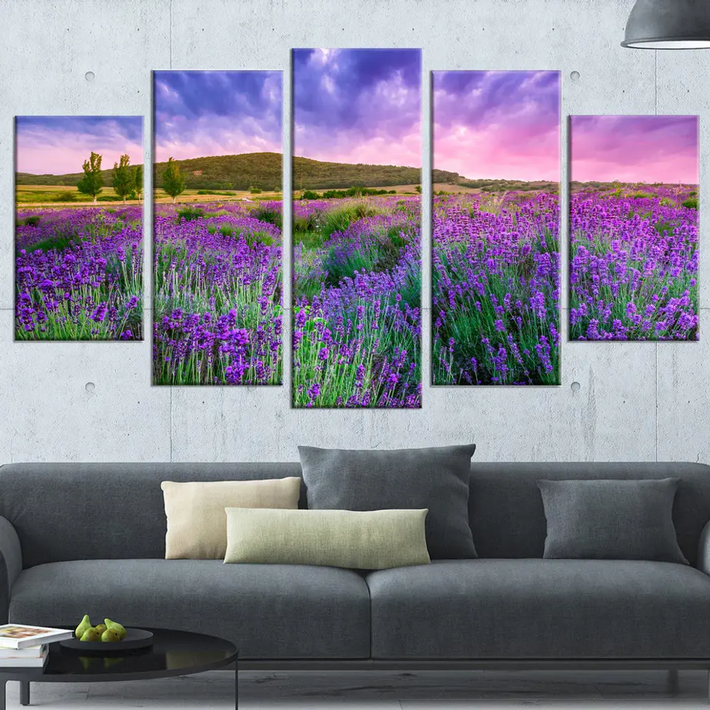"Summer Lavender Field In Tihany" Modern Landscape Wall Art, 5 Panels, 60"x32"