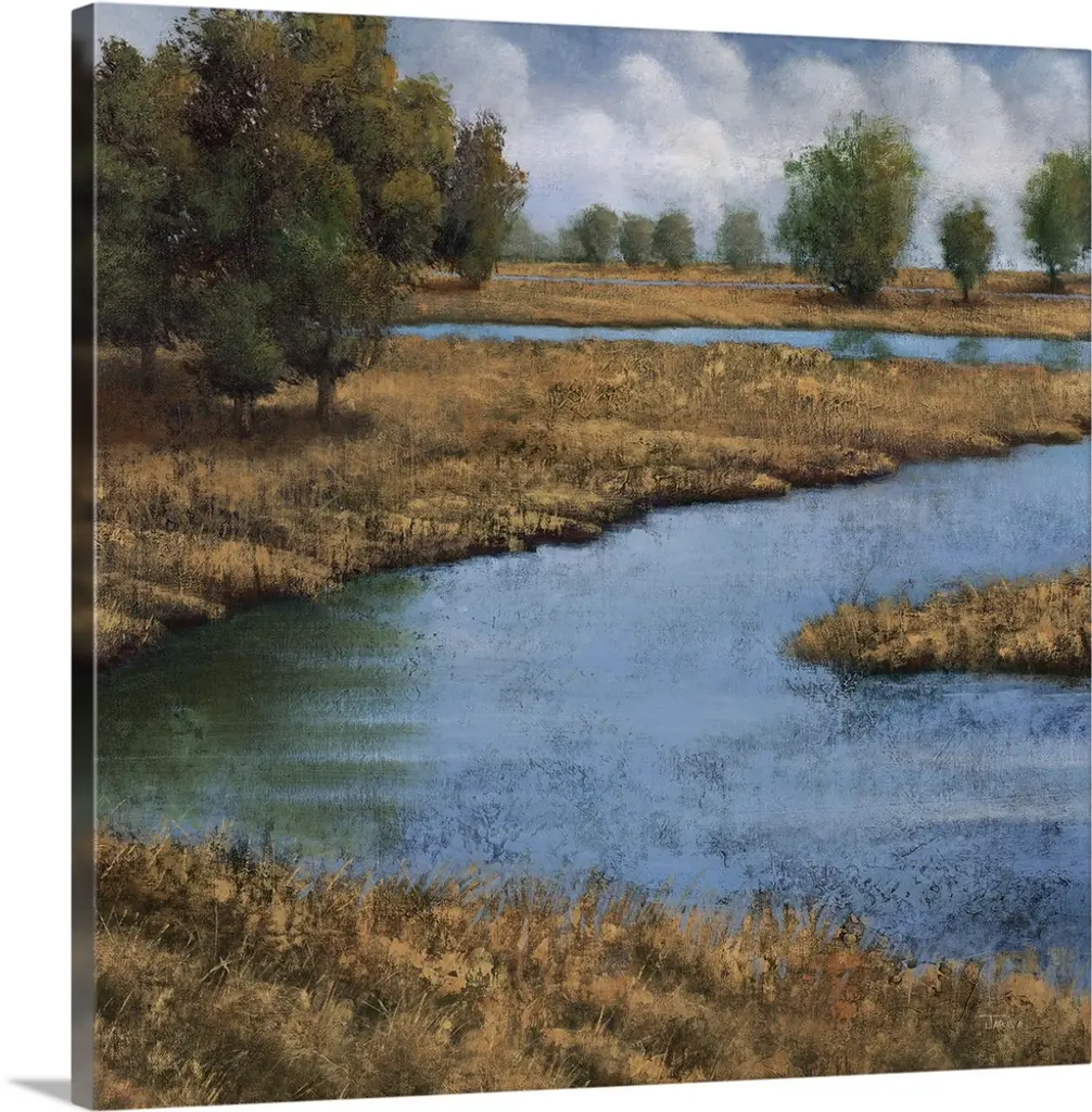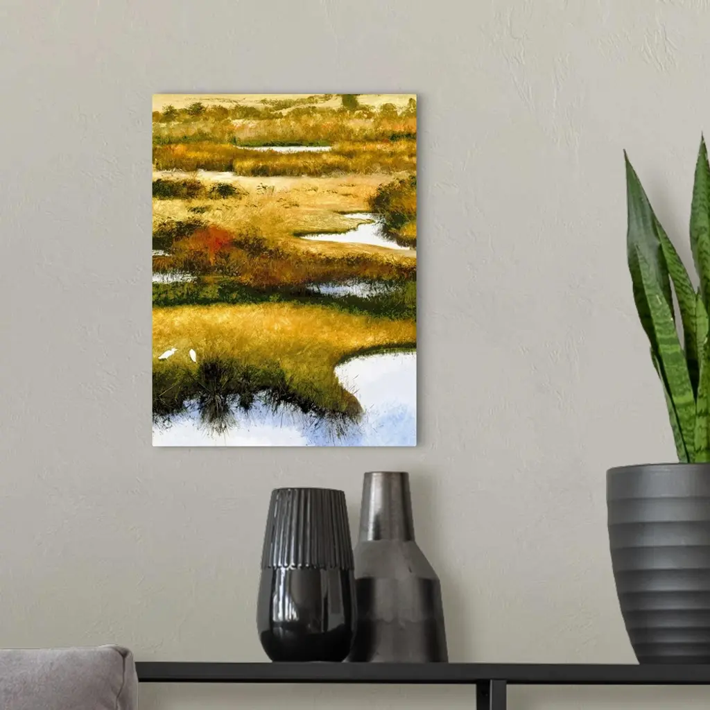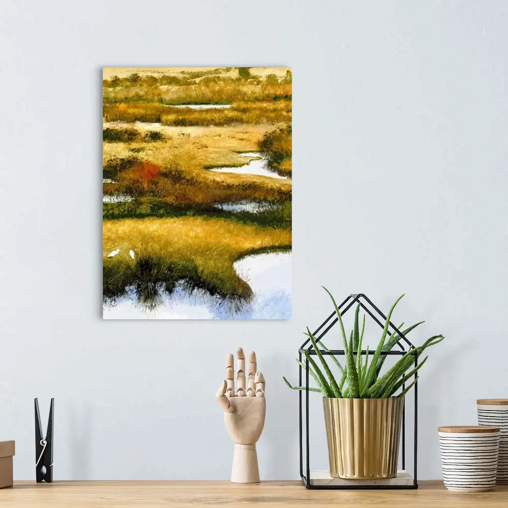 Contemporary painting of two seabirds feeding in a marsh.